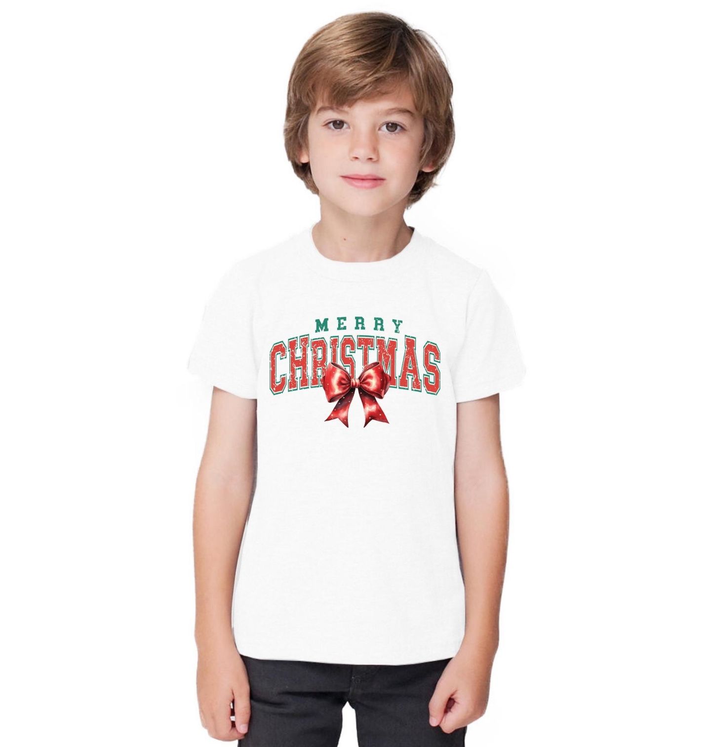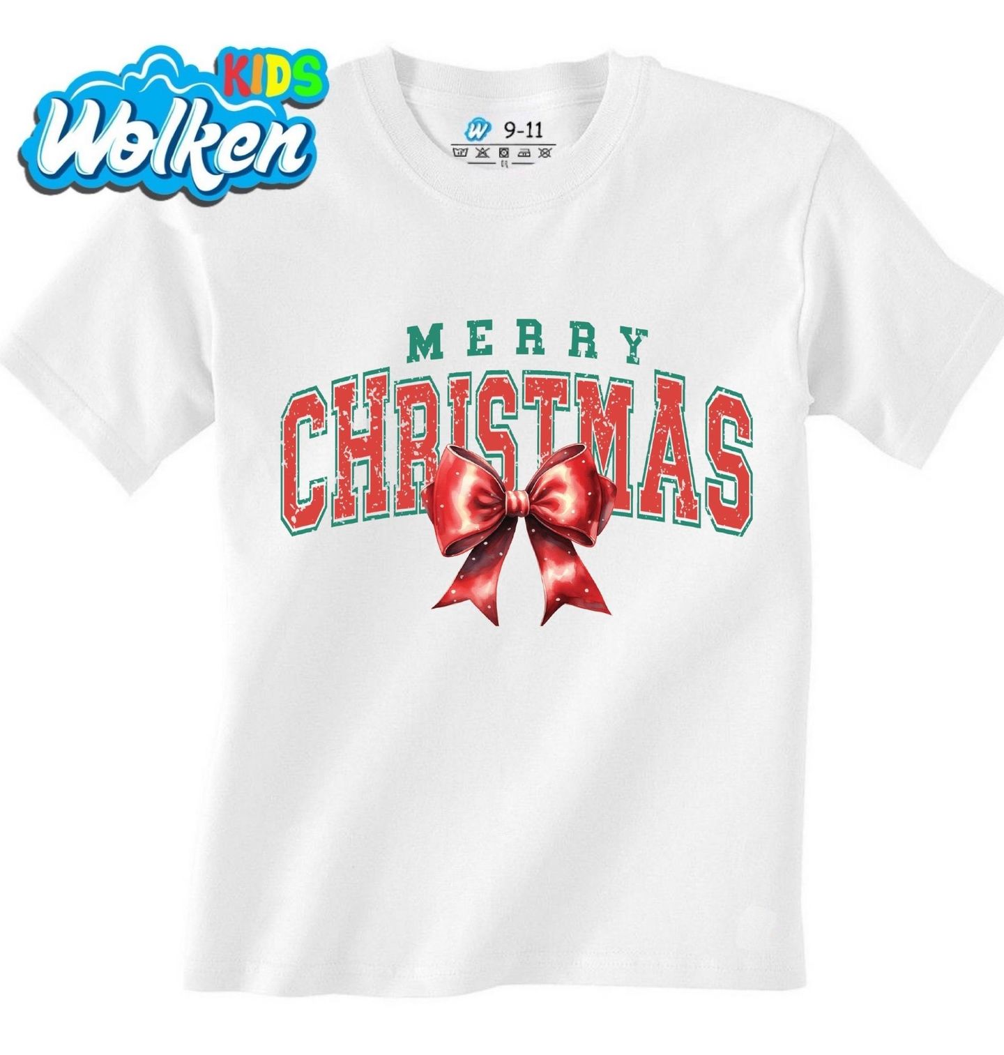 Dětské tričko Vánoční mašle Merry Christmas. Elegantní a výrazný motiv s nápisem „Veselé Vánoce“ a červenou mašlí je ideální volbou pro každého, kdo miluje tradiční sváteční atmosféru s nádechem slavnostní elegance. Vánoce jsou o radosti, a tento design vám ji připomene každý den.