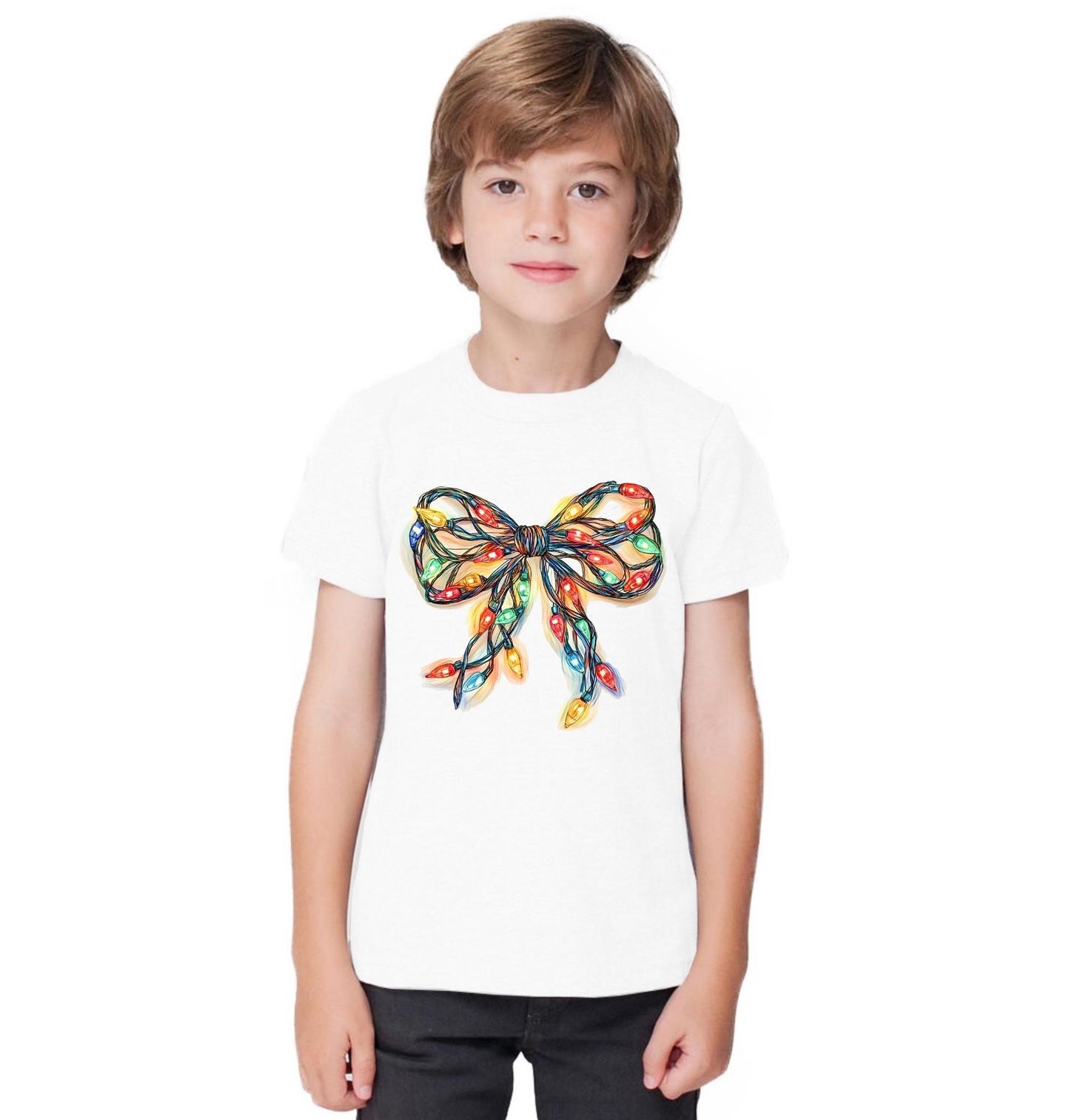 Dětské tričko Vánoční Mašle ze Světýlek. Rozzařte Vánoce tím nejkouzelnějším způsobem! Tento originální motiv zobrazuje mašli vytvořenou ze svítících vánočních světýlek, která je ideálním symbolem radosti, dekorací i slavnostní atmosféry. Dokonalý vánoční dárek, tahle světelná mašle je zárukou úsměvu pod stromečkem!