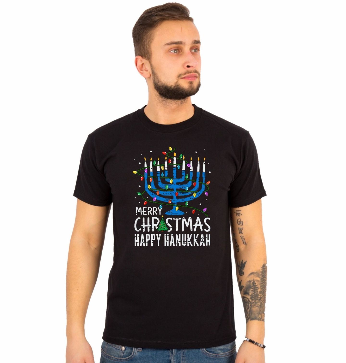 Pánské tričko Vánoční Menora Happy Hanukkah. Originální a vtipný motiv, který spojuje Vánoce a židovský svátek Chanuka. Uprostřed je velký chanukový svícen menora obtočený vánočními světýlky, pod ním nápis „Merry Christmas, Happy Hanukkah“ - „Veselé Vánoce, šťastnou Chanuku“.