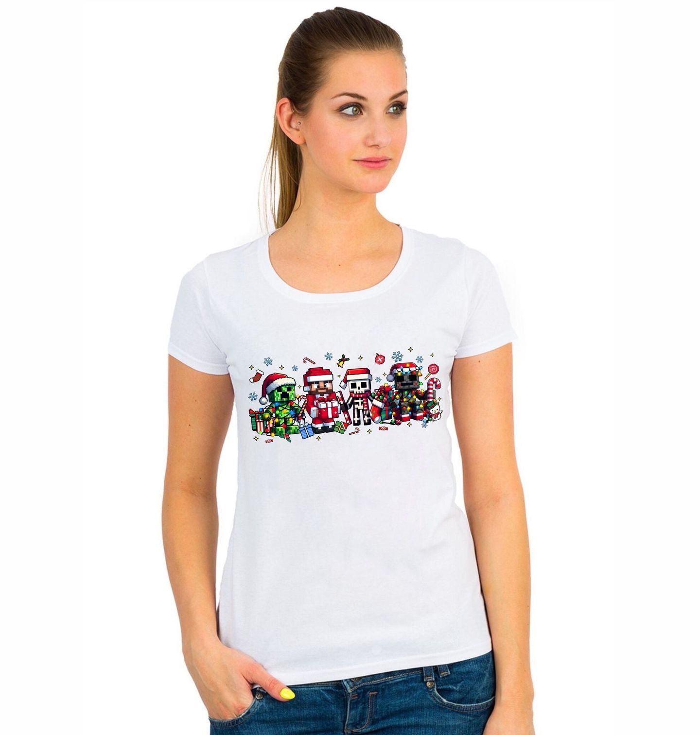 Dámské tričko Vánoční Minecraft Postavičky. Vánoce dorazily i do světa Minecraft! V hlavní roli legendární Creeper, dobrodruh Steve, klasický kostlivec a temný Wither Skeleton, všichni ve vánočním vydání. Tahle pixelová parta s dárky, cukrovými hůlkami, světýlky a čepicemi ti přinese pořádnou dávku sváteční atmosféry do každého dne.
