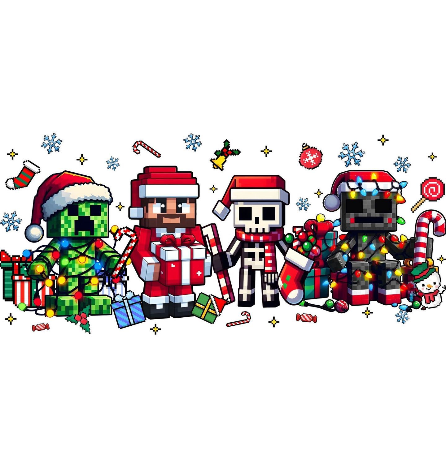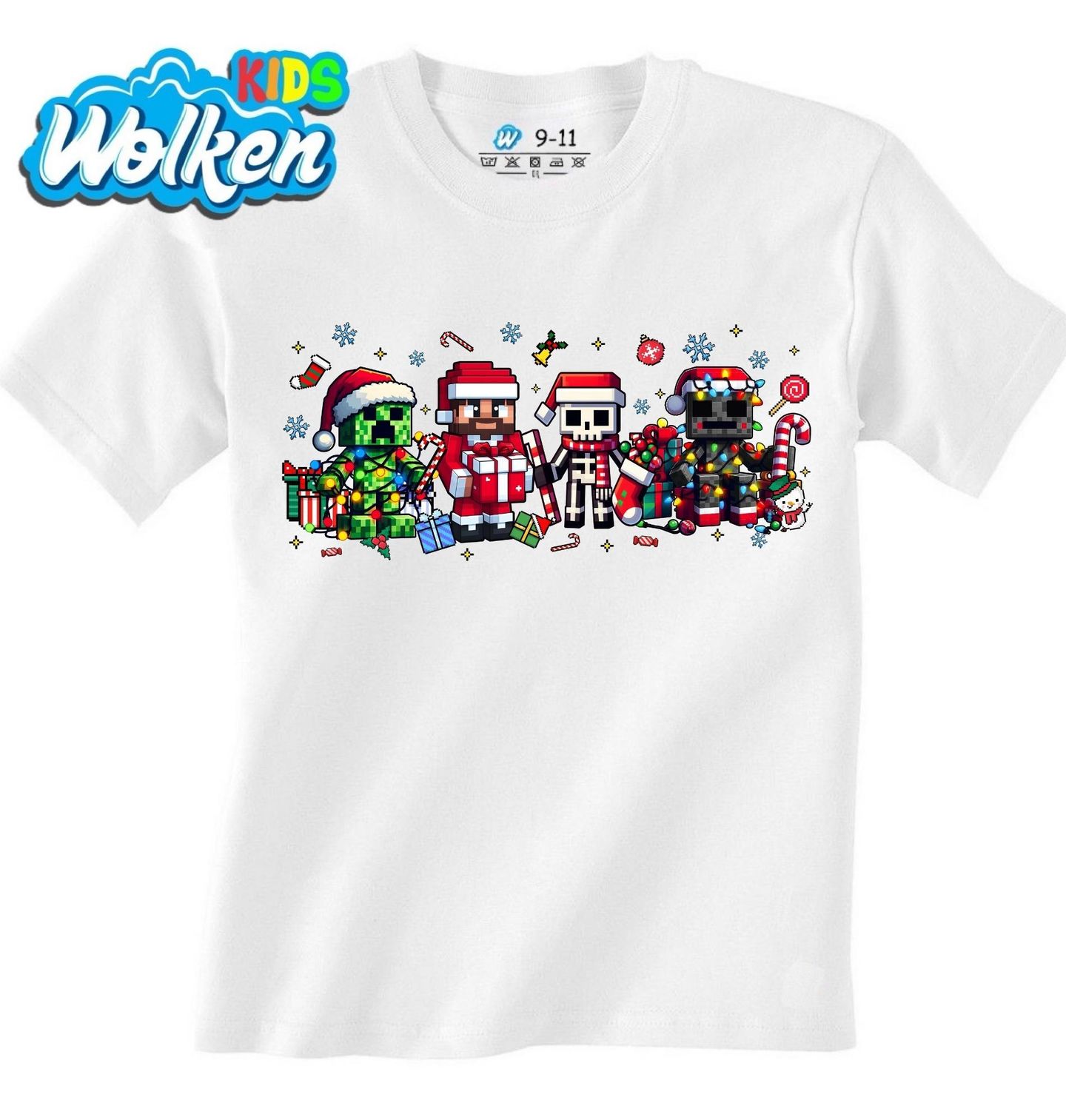 Dětské tričko Vánoční Minecraft Postavičky. Vánoce dorazily i do světa Minecraft! V hlavní roli legendární Creeper, dobrodruh Steve, klasický kostlivec a temný Wither Skeleton, všichni ve vánočním vydání. Tahle pixelová parta s dárky, cukrovými hůlkami, světýlky a čepicemi ti přinese pořádnou dávku sváteční atmosféry do každého dne.
