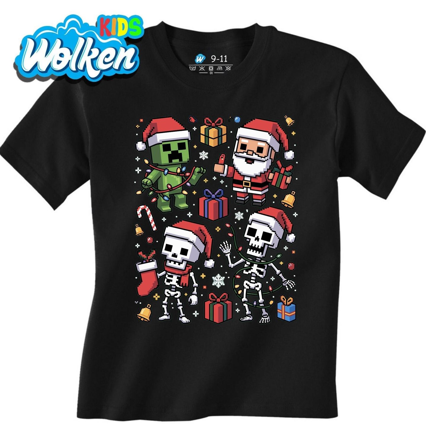 Dětské tričko Vánoční Minecraft Santa a Creeper. V hlavní roli klasické gaming postavy ze světa Minecraft – veselý Santa s dárky, legendární Creeper omotaný světýlky a kostlivec připraven na zimní videohry. Celou scénu doplňují vánoční dekorace, dárky, sněhové vločky a cukrové hůlky. Ideální dárek pro každého hráče, který chce slavit Vánoce stylově