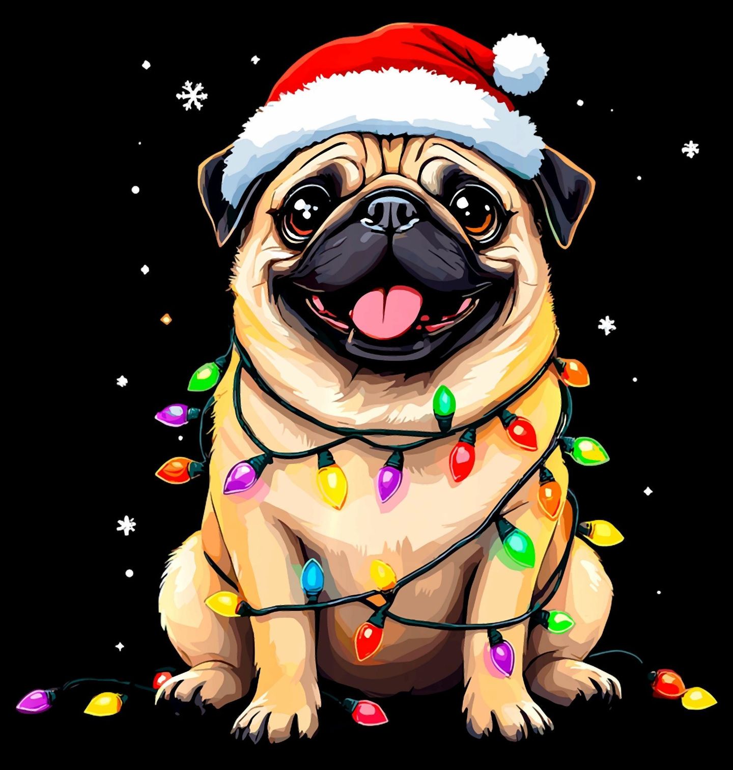Dětské tričko Vánoční Mops ve Světýlkách. Rozzařte Vánoce úsměvem s tímto veselým motivem roztomilého mopse! Tento pes v Santa čepici omotaný barevnými světýlky je jako stvořený pro každého pejskaře, který chce dodat svátkům hravou a vtipnou atmosféru.