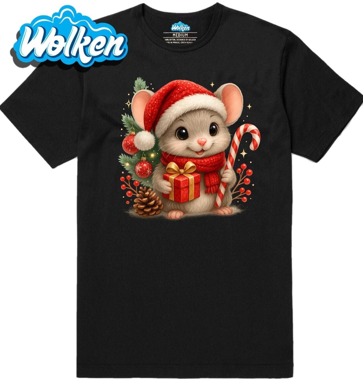 Pánské tričko Vánoční Myš. Motiv zobrazuje rozkošnou myšku v červené vánoční čepici, která drží vánoční dárek a pruhovanou cukrovou hůlku. Okolo jsou vánoční ozdoby, větvička s červenými bobulemi, šiška a kouzelný stromeček. Ideální pro ty, co milují Vánoce a hlodavec je jejich rodina.