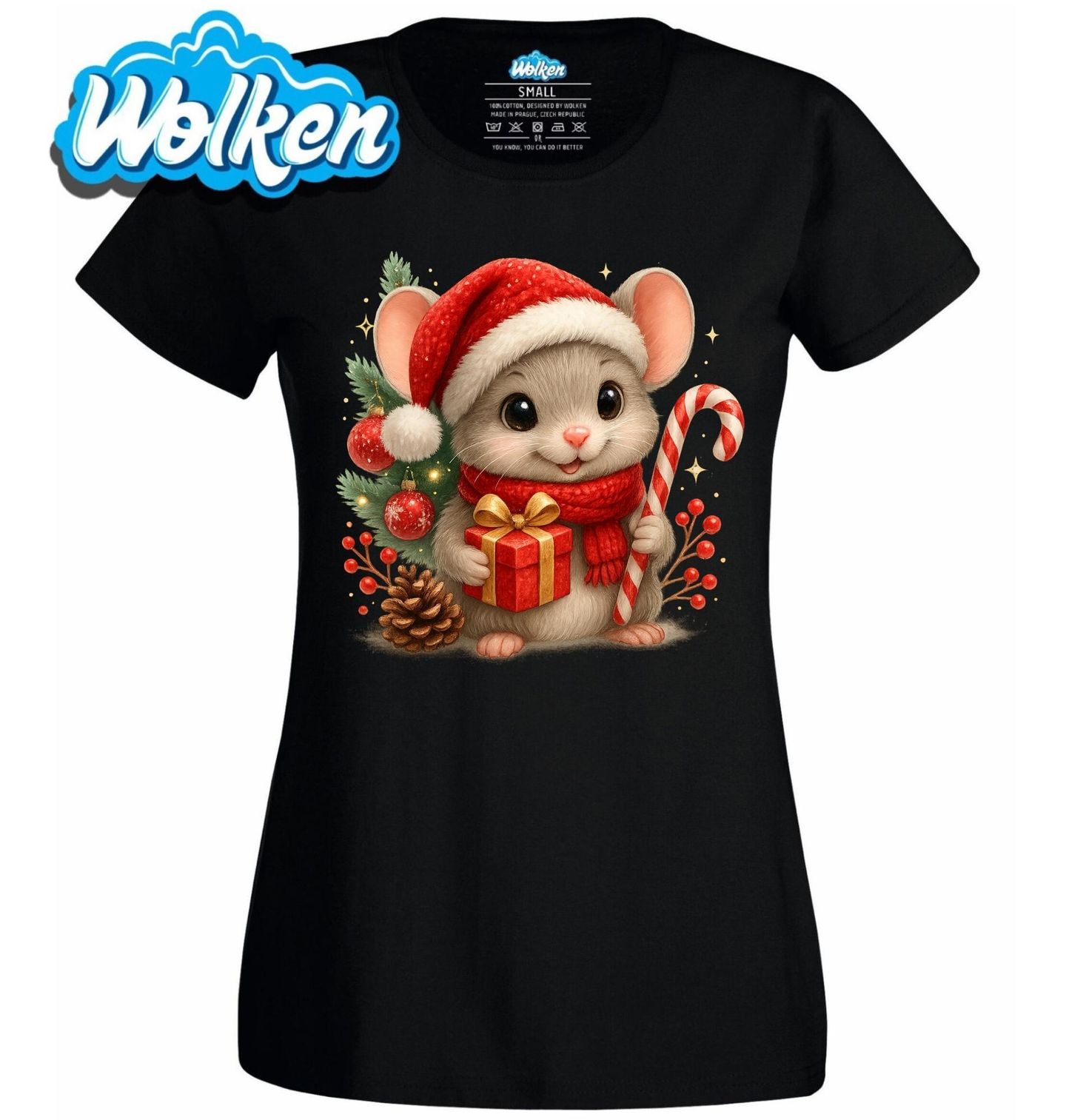 Dámské tričko Vánoční Myš. Motiv zobrazuje rozkošnou myšku v červené vánoční čepici, která drží vánoční dárek a pruhovanou cukrovou hůlku. Okolo jsou vánoční ozdoby, větvička s červenými bobulemi, šiška a kouzelný stromeček. Ideální pro ty, co milují Vánoce a hlodavec je jejich rodina.