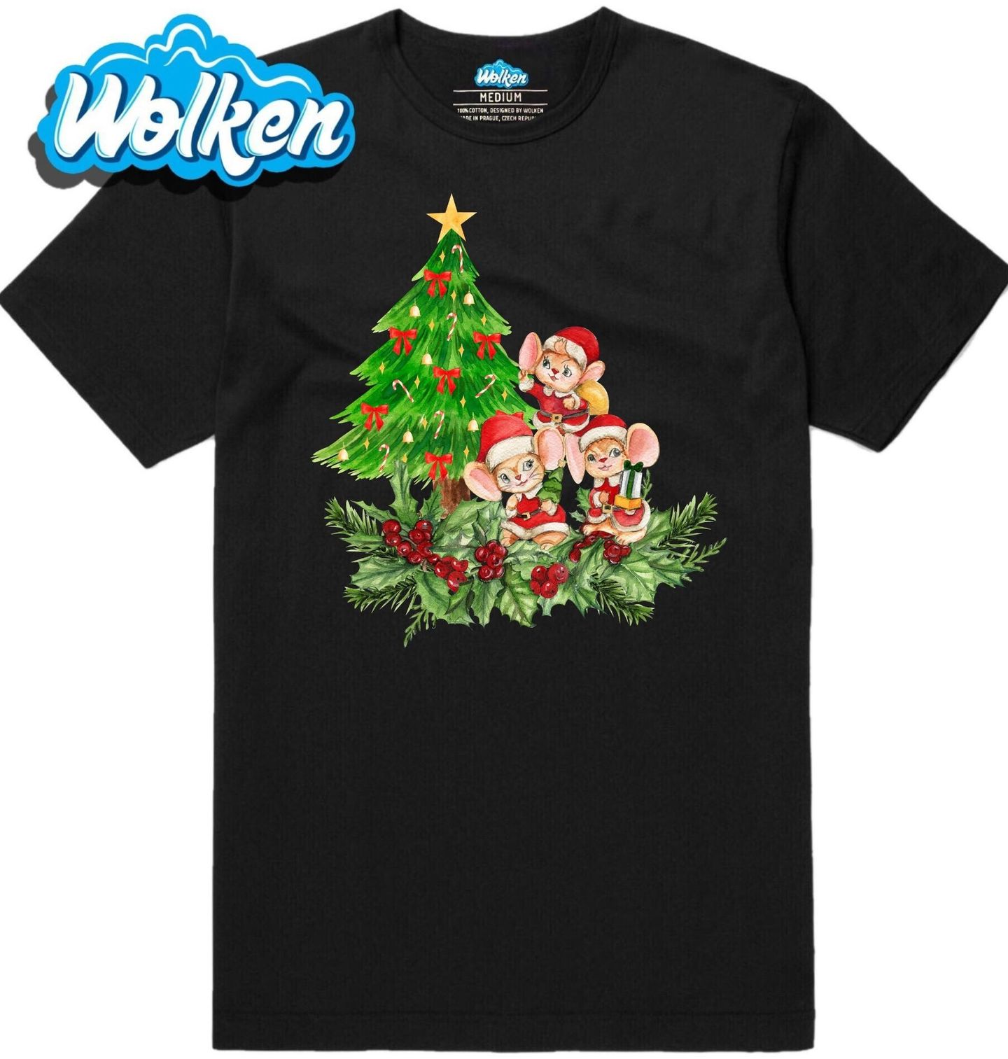 Pánské tričko Vánoční Myšky pod Stromečkem. Roztomilý motiv tří malých myšek v santovských oblečcích, jak si užívají Vánoce u ozdobeného stromečku, ti vykouzlí úsměv na tváři i v těch nejmrazivějších dnech. Akvarelový styl dodává ilustraci pohádkovou atmosféru, která se hodí pro každého milovníka zvířátek a sváteční nálady.