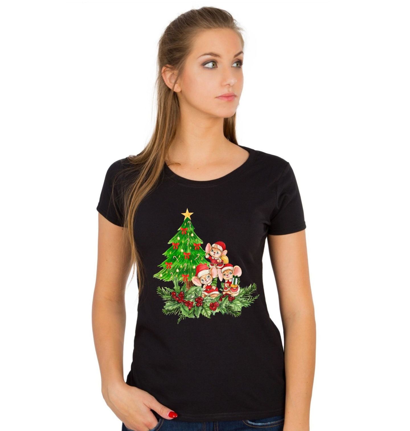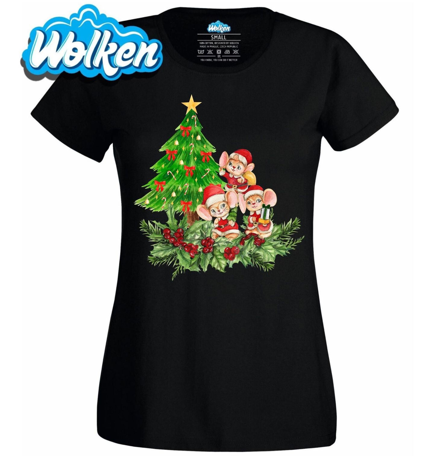 Dámské tričko Vánoční Myšky pod Stromečkem. Roztomilý motiv tří malých myšek v santovských oblečcích, jak si užívají Vánoce u ozdobeného stromečku, ti vykouzlí úsměv na tváři i v těch nejmrazivějších dnech. Akvarelový styl dodává ilustraci pohádkovou atmosféru, která se hodí pro každého milovníka zvířátek a sváteční nálady.