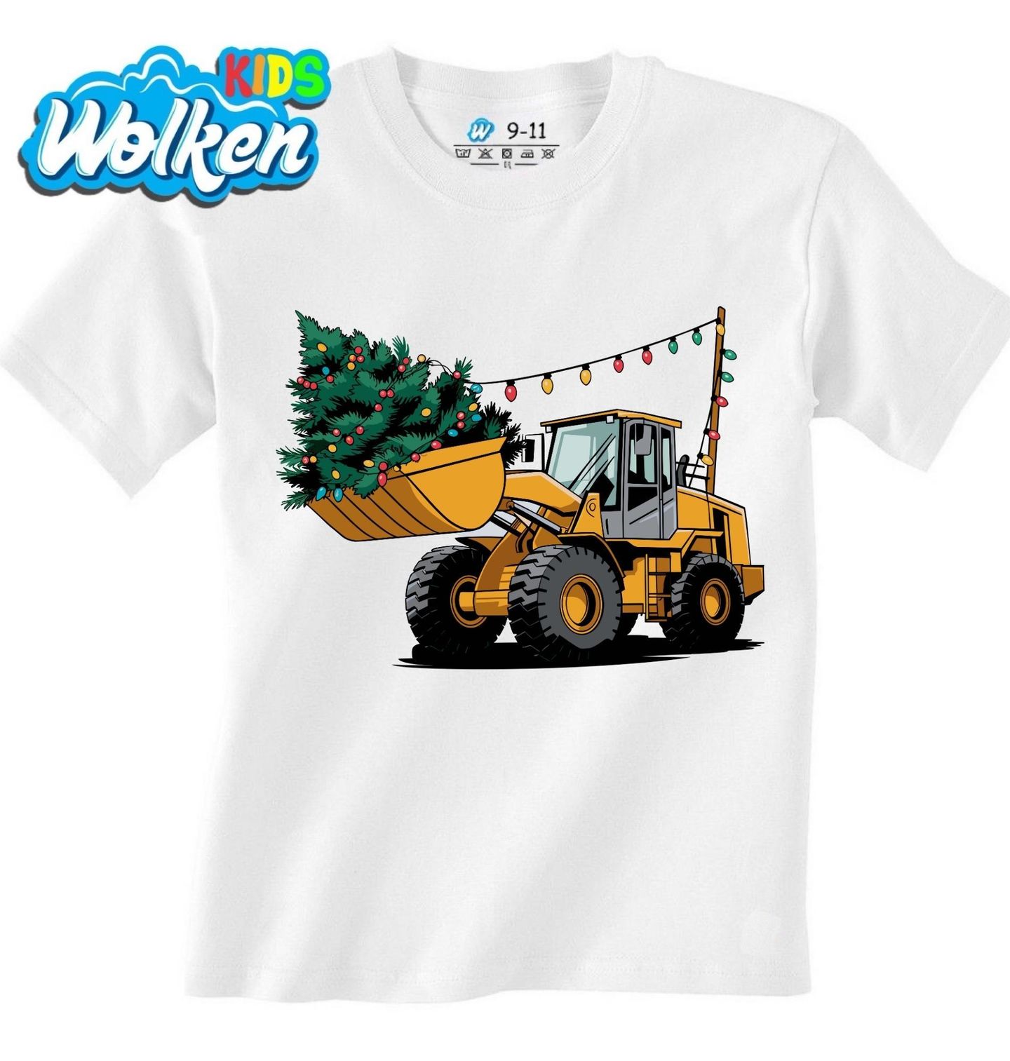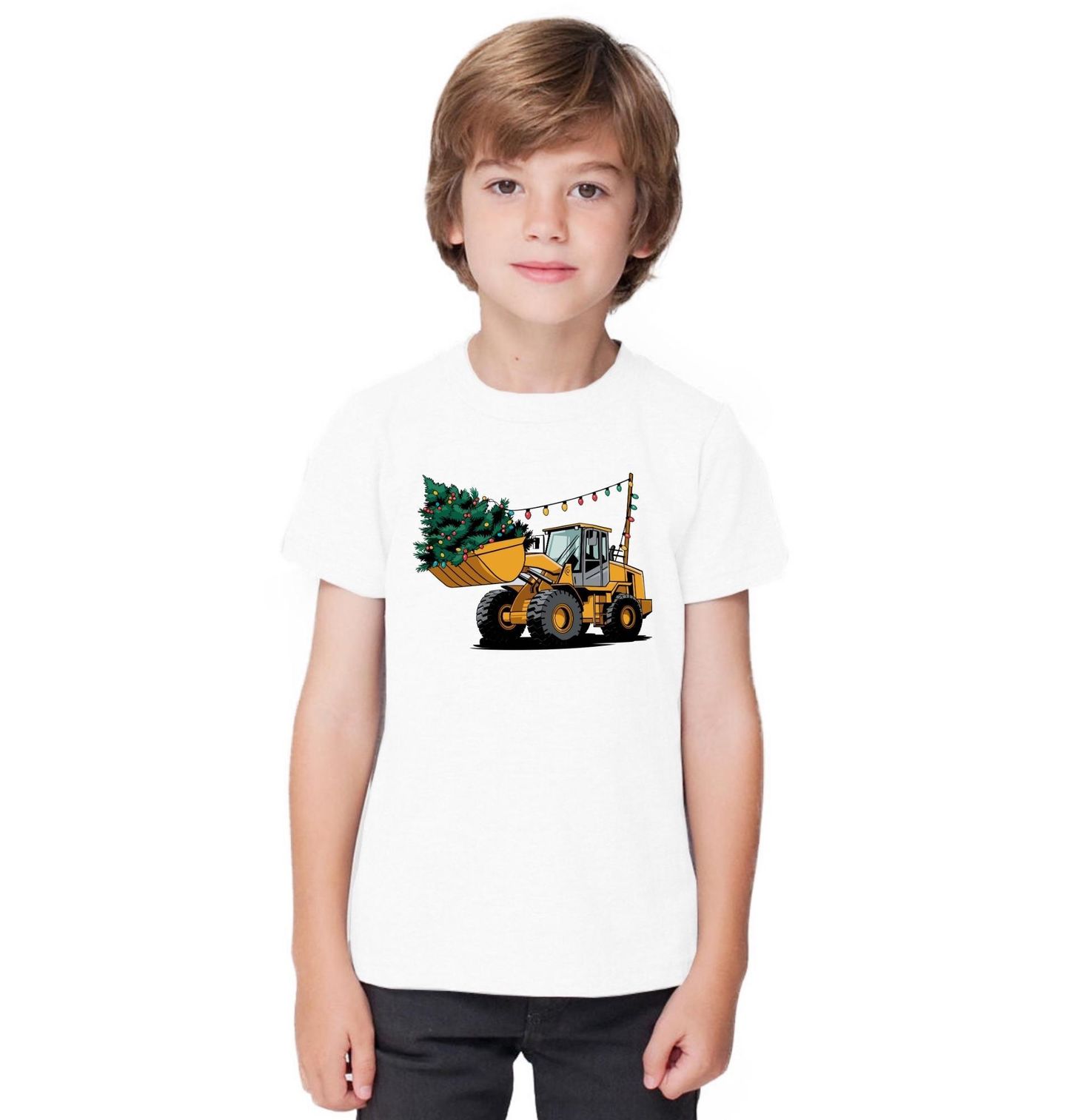 Dětské tričko Vánoční Nakladač. Vánoce mohou dorazit i ve velkém stylu! Tento vtipný a originální motiv zobrazuje silný stavební stroj, který veze ozdobený vánoční stromeček – ideální pro všechny, kdo milují techniku, bagry, nakladače nebo traktory. Připomeňte si, že i ve světě těžké práce mají Vánoce své kouzlo.