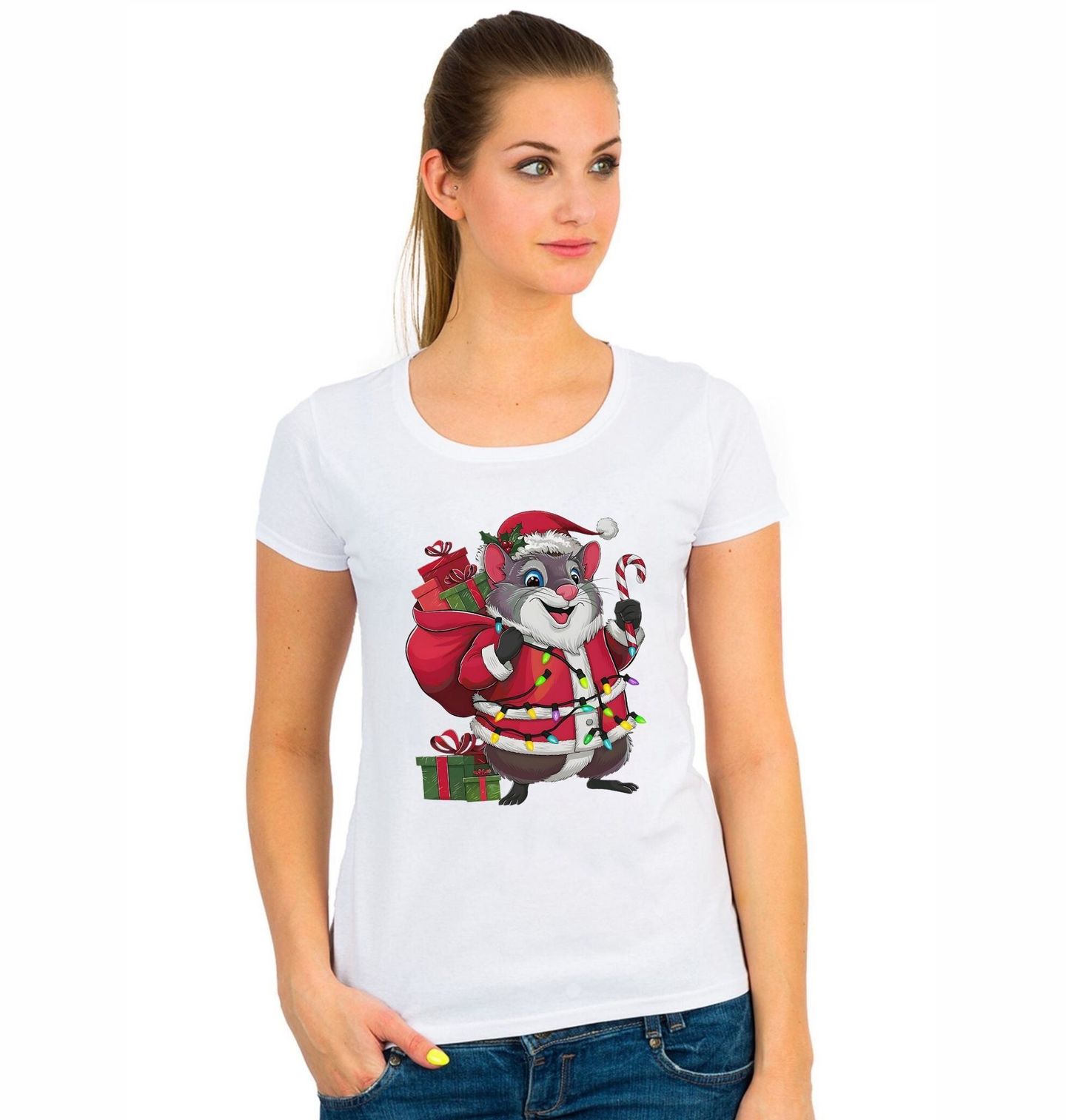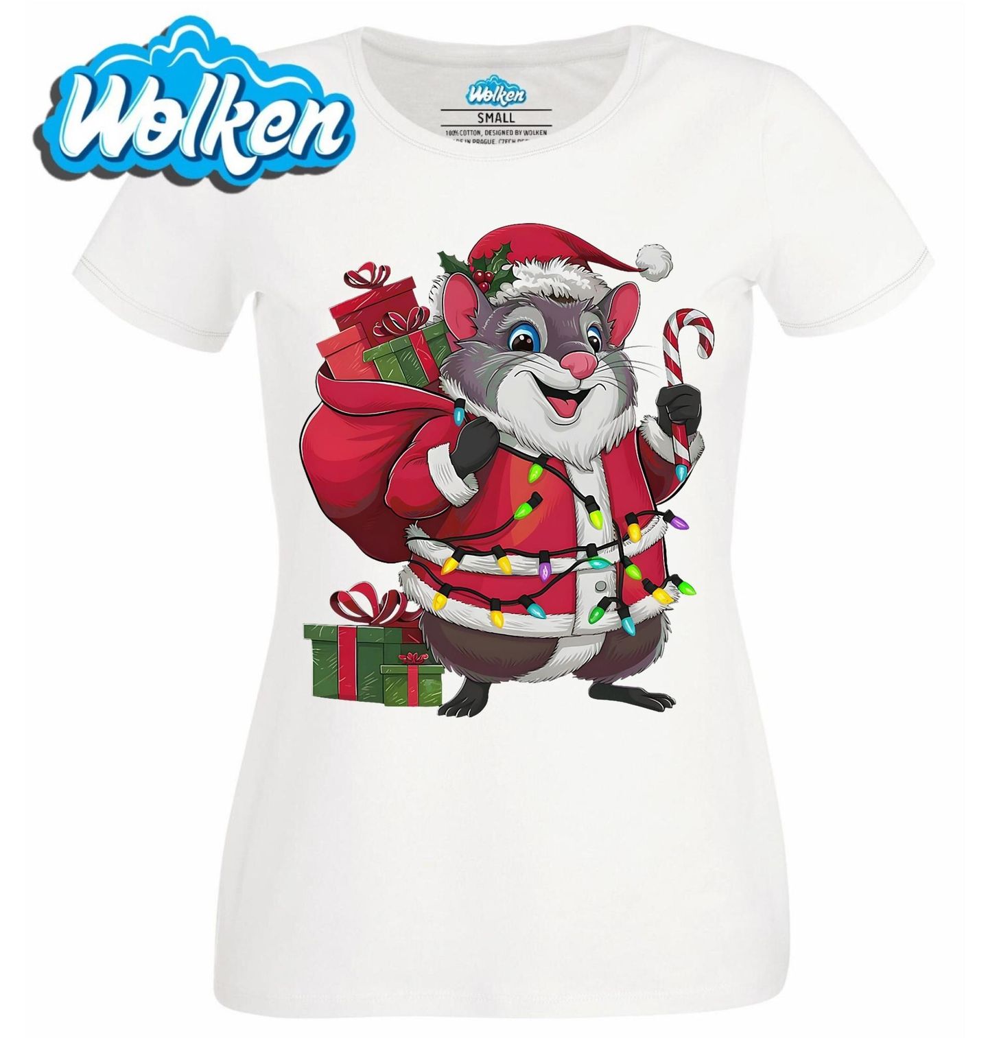 Dámské tričko Vánoční Osmák degu. Osmák degu je malý chilský hlodavec, lidově přezdívaný též chilská veverka. Připrav se na originální sváteční náladu s tímto roztomilým motivem, kde osmák degu slaví Vánoce jako pravý Santa. Malý hlodavec v červeném kabátku nese pytel plný dárků, je ověšený barevnými světýlky a v tlapce drží sladkou hůlku.
