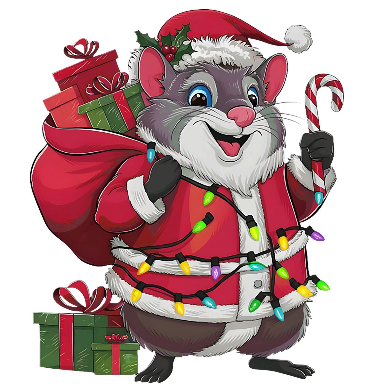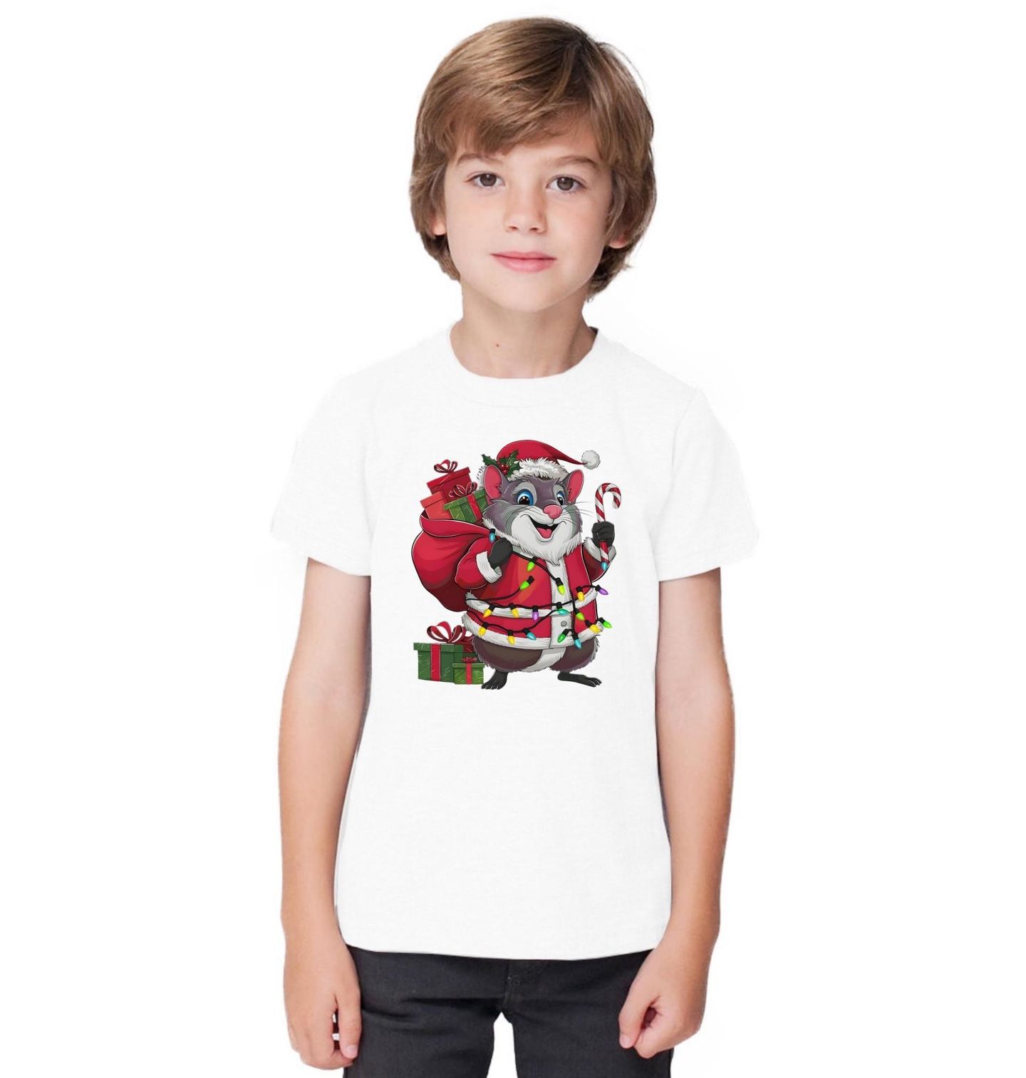 Dětské tričko Vánoční Osmák degu. Osmák degu je malý chilský hlodavec, lidově přezdívaný též chilská veverka. Připrav se na originální sváteční náladu s tímto roztomilým motivem, kde osmák degu slaví Vánoce jako pravý Santa. Malý hlodavec v červeném kabátku nese pytel plný dárků, je ověšený barevnými světýlky a v tlapce drží sladkou hůlku.
