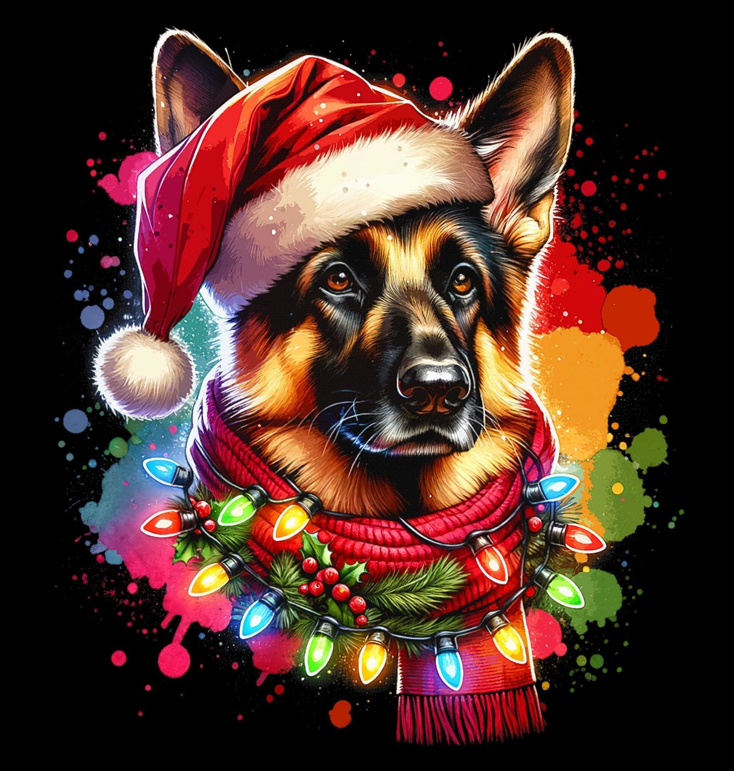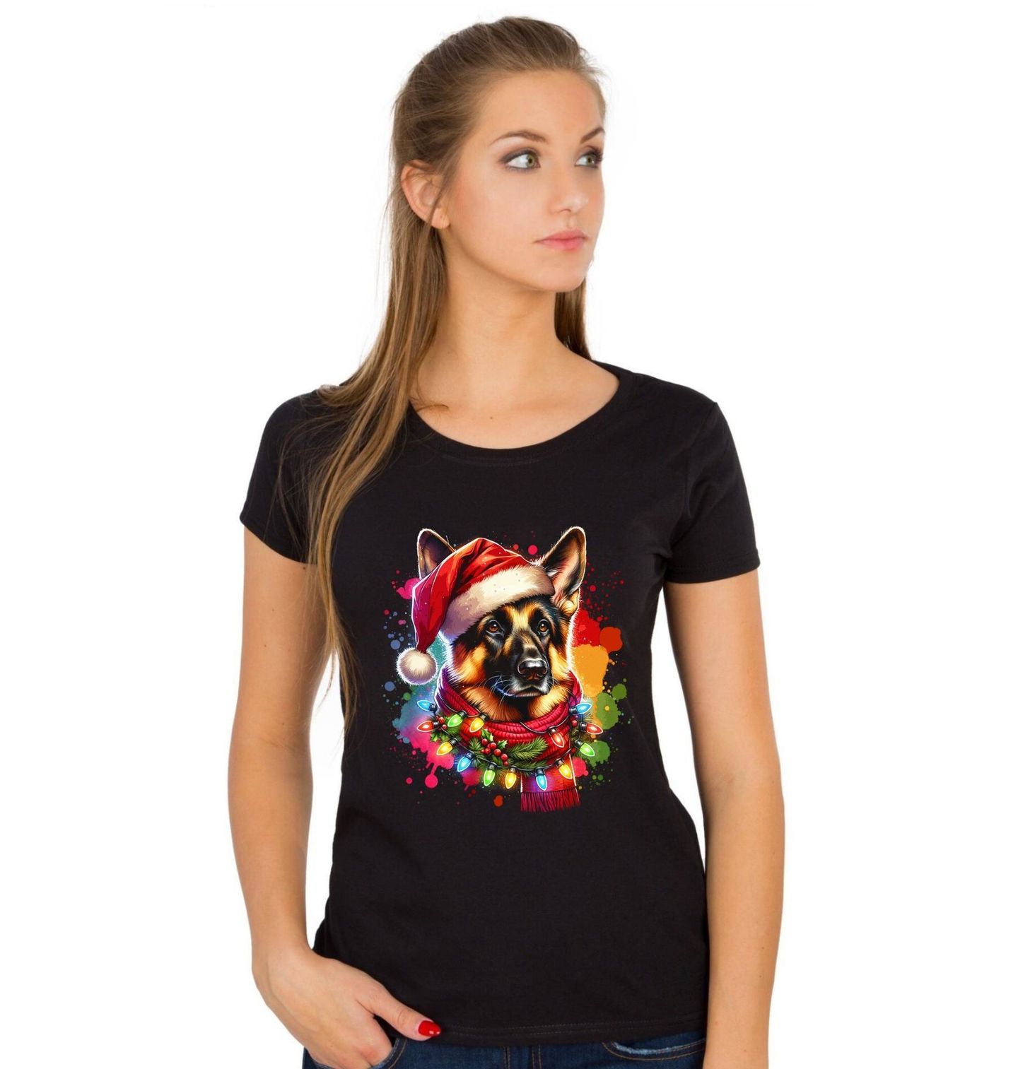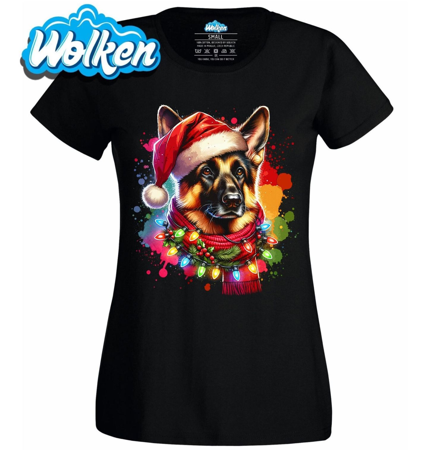 Dámské tričko Vánoční ovčák v Santa Čepici. Stylový vánoční motiv pro všechny milovníky psů! Pes v Santa čepici, ozdobený světýlky a šálou, je připraven šířit sváteční atmosféru. Motiv zachycuje krásného německého ovčáka, plemeno známé svou věrností a oddaností, díky čemuž se tento design stane skvělým dárkem pro každého pejskaře, který miluje Vánoce.