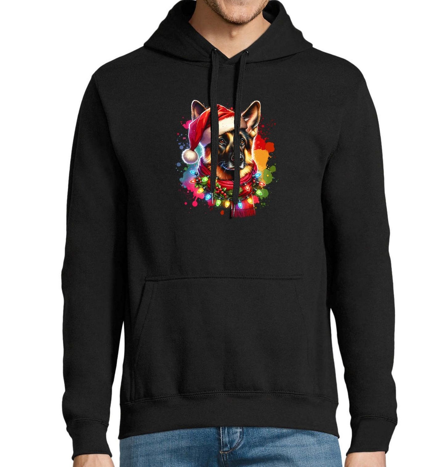 Pánská mikina Vánoční ovčák v Santa Čepici. Stylový vánoční motiv pro všechny milovníky psů! Pes v Santa čepici, ozdobený světýlky a šálou, je připraven šířit sváteční atmosféru. Motiv zachycuje krásného německého ovčáka, plemeno známé svou věrností a oddaností, díky čemuž se tento design stane skvělým dárkem pro každého pejskaře, který miluje Vánoce.