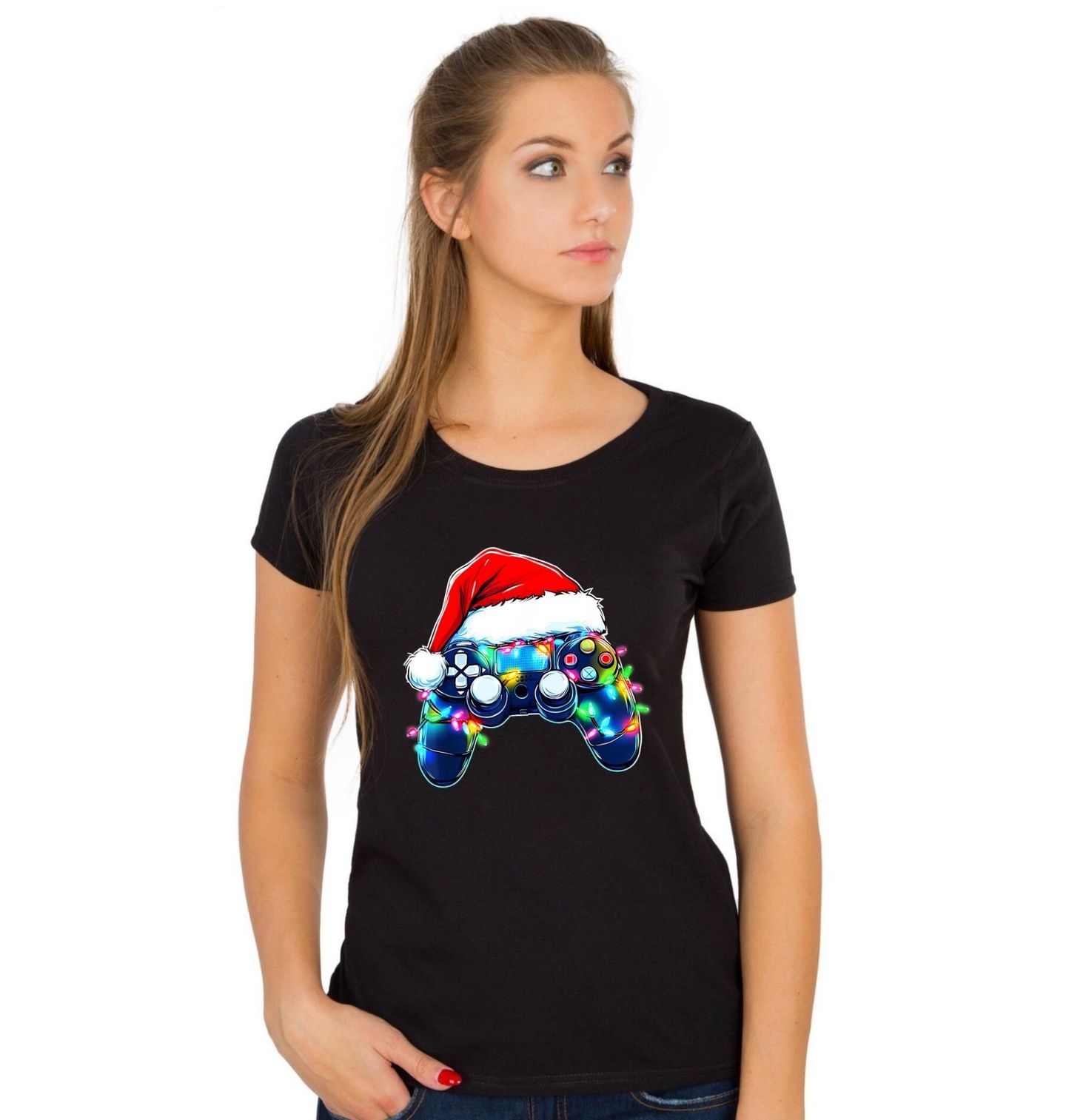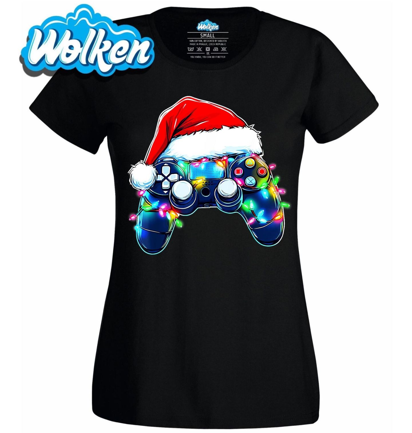Dámské tričko Vánoční Ovladač s Čepicí. Stylový herní ovladač obtočený vánočními světýlky a ozdobený čepicí Santa Clause je dokonalým symbolem spojení vánoční pohody a vášnivého gamingu. Motiv je ideální pro každého hráče, koho baví gaming, miluje ovladač ve vlastních rukou a chce si užít Vánoce s herní náladou.