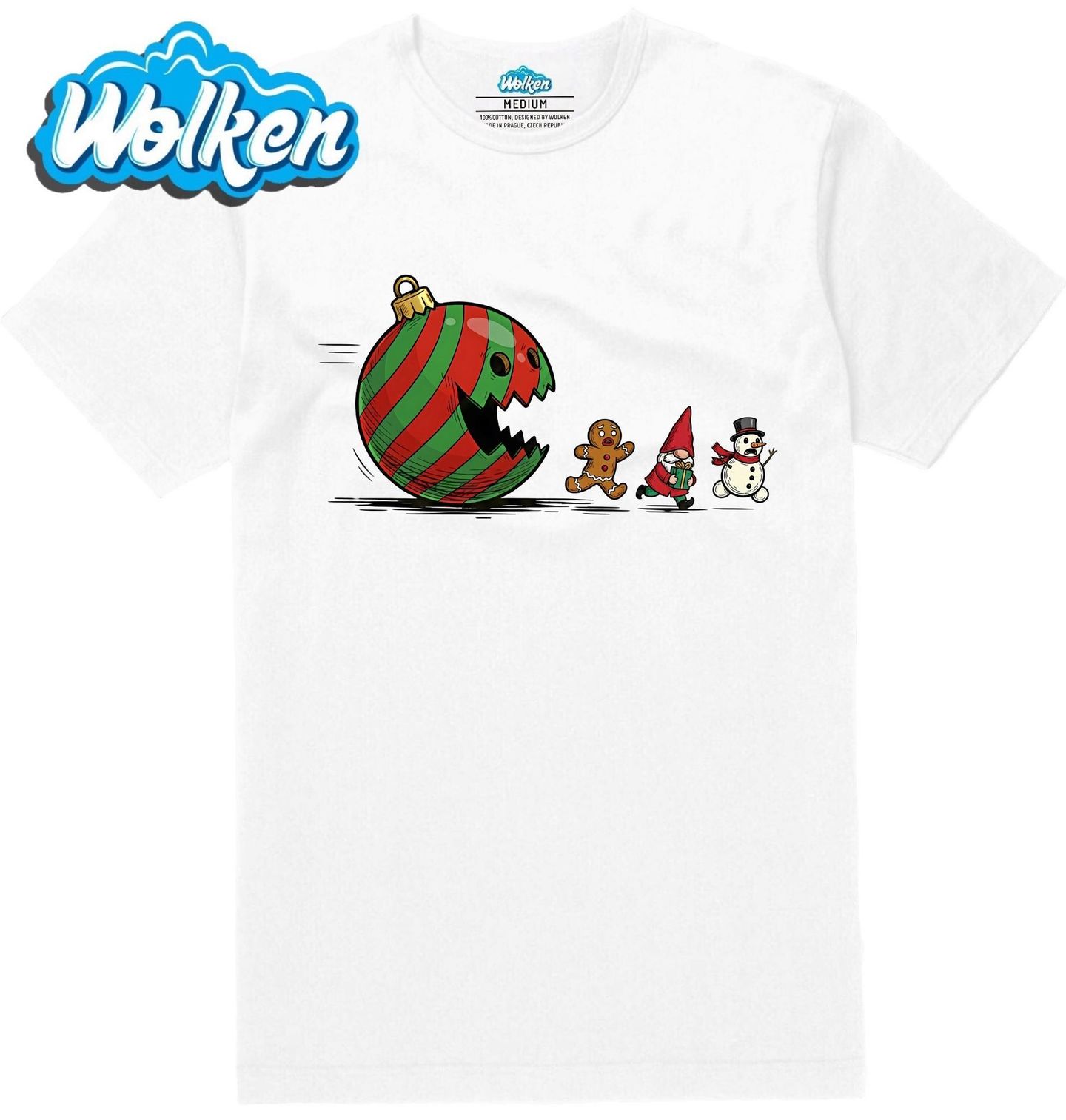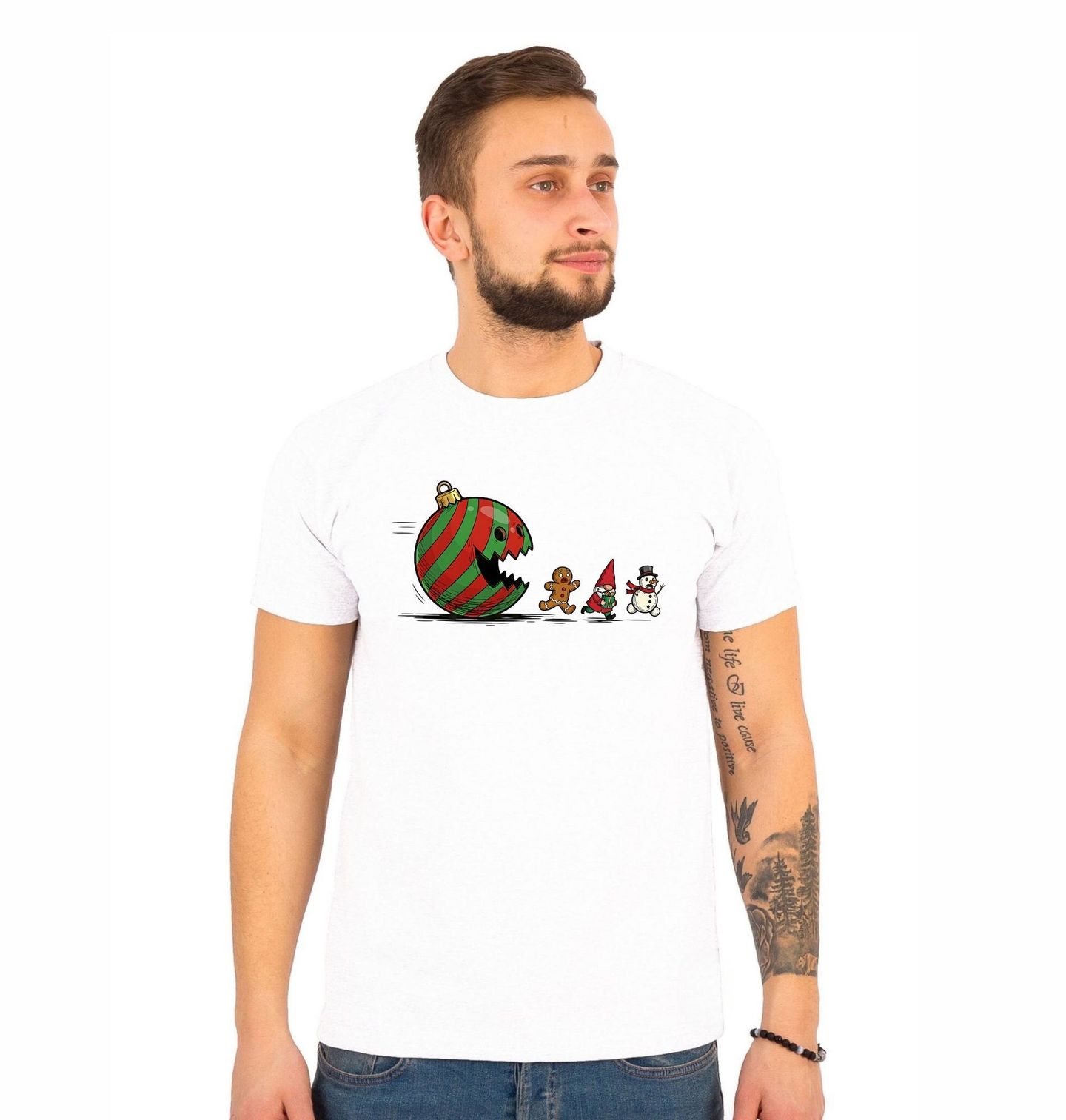 Pánské tričko Vánoční Pac-Man. Co se stane, když se spojí Vánoce, legendární Pacman, a trochu filmové parodie? Vznikne tenhle šíleně zábavný motiv! Vánoční ozdoba ve stylu Pacmana honí vyděšený perníček, skřítka s dárkem i běžícího sněhuláka – jako by utekli z animované pohádky nebo vánočního filmu.
