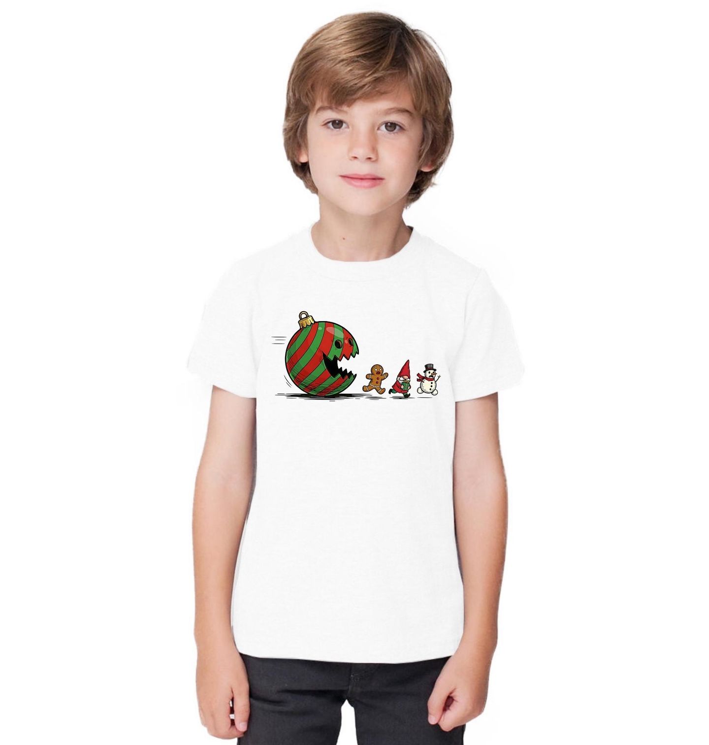 Dětské tričko Vánoční Pac-Man. Co se stane, když se spojí Vánoce, legendární Pacman, a trochu filmové parodie? Vznikne tenhle šíleně zábavný motiv! Vánoční ozdoba ve stylu Pacmana honí vyděšený perníček, skřítka s dárkem i běžícího sněhuláka – jako by utekli z animované pohádky nebo vánočního filmu.