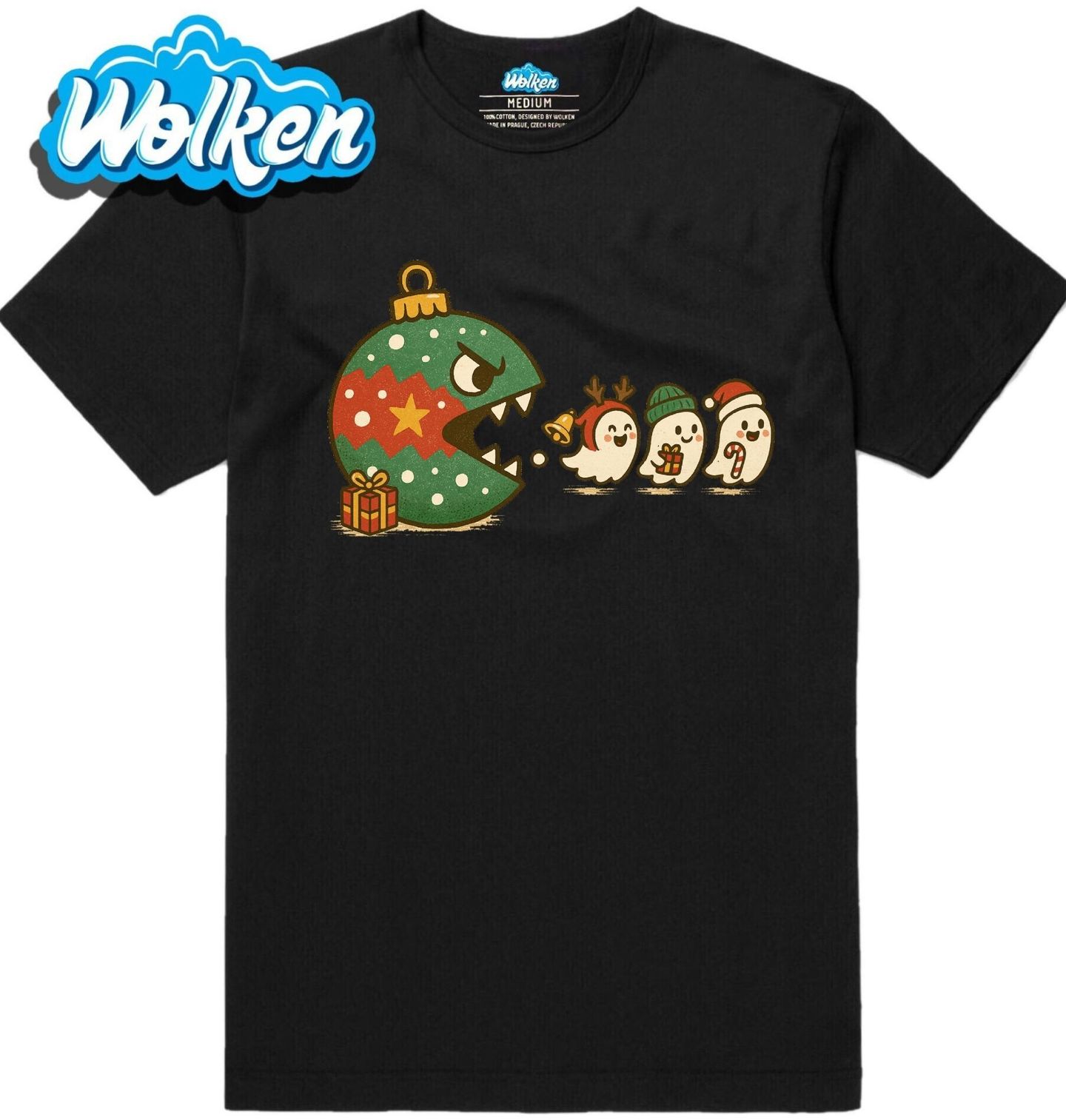 Pánské tričko Vánoční Pac-Man Ghostbusters. Co dostanete, když smícháte Vánoce, legendárního Pac-Mana a kultovní film Ghostbusters? Tenhle výjimečný motiv! Vánoční ozdoba s ostrými zuby ve stylu Pac-Mana nahání tři duchy v zimních čepicích a sobích parůžcích – a paroduje tak slavné herní i filmové momenty.