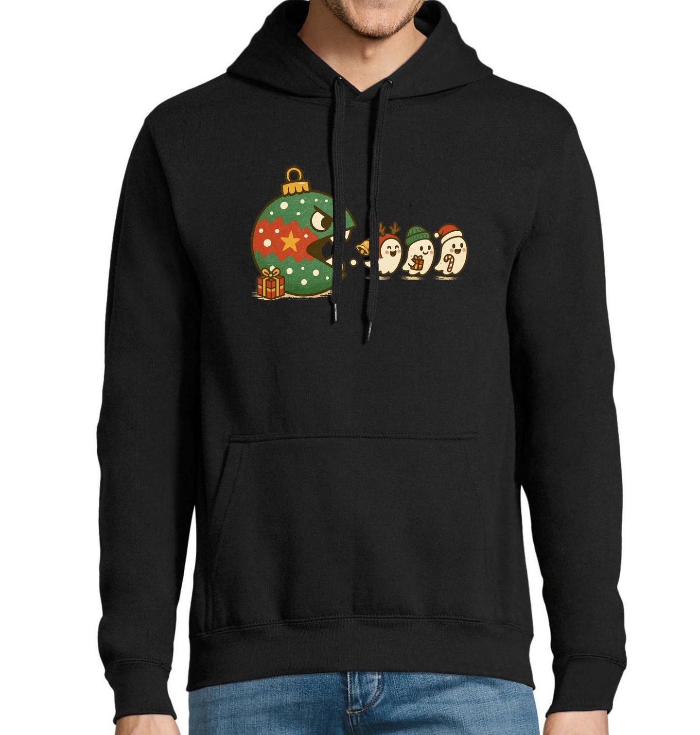 Pánská mikina Vánoční Pac-Man Ghostbusters. Co dostanete, když smícháte Vánoce, legendárního Pac-Mana a kultovní film Ghostbusters? Tenhle výjimečný motiv! Vánoční ozdoba s ostrými zuby ve stylu Pac-Mana nahání tři duchy v zimních čepicích a sobích parůžcích – a paroduje tak slavné herní i filmové momenty.