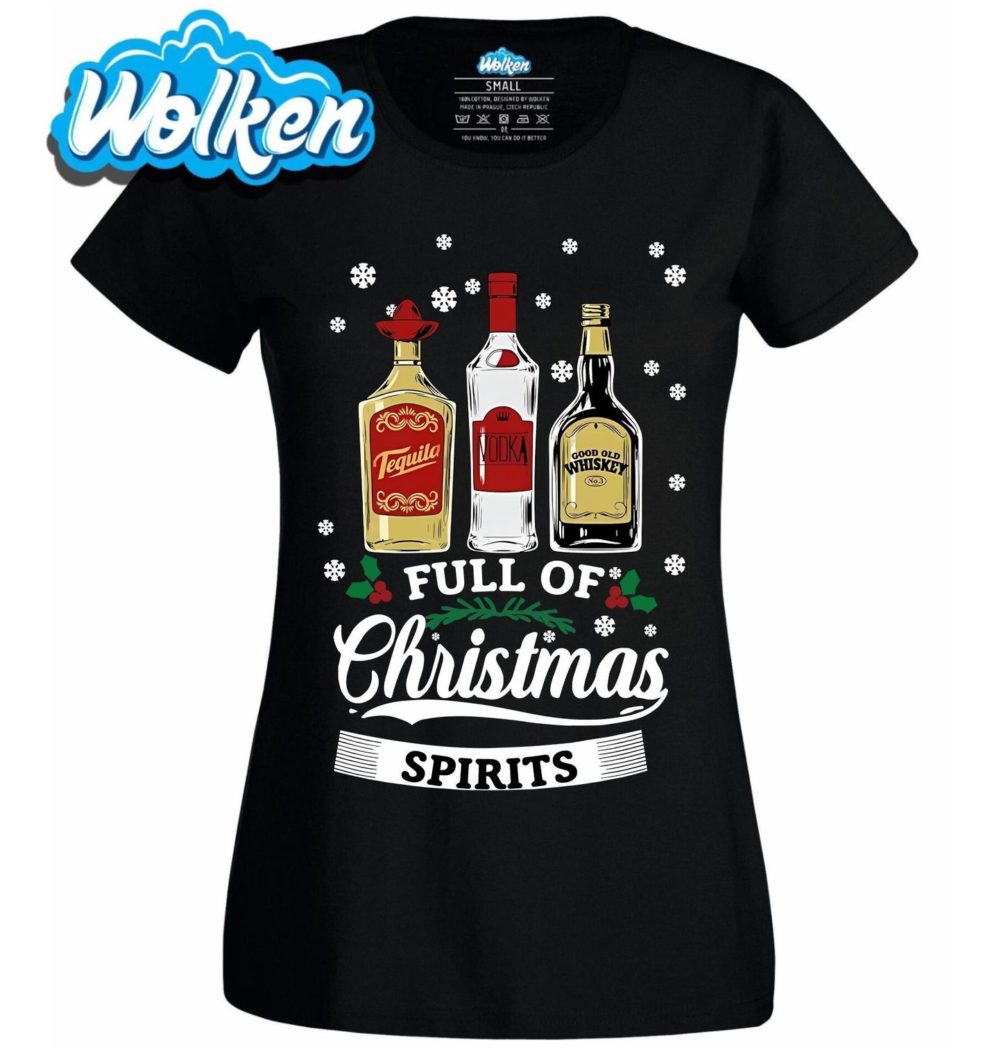 Dámské tričko Vánoční Panák Christmas Spirits. Vánoce, alkohol a pořádná párty? Tento zábavný motiv „Full of Christmas Spirits“ říká vše za vás! Tequila, vodka i whisky – ať už hledáte vtipné vánoční tričko na večírek, nebo originální dárek pro kamaráda s (ne)střízlivým humorem.