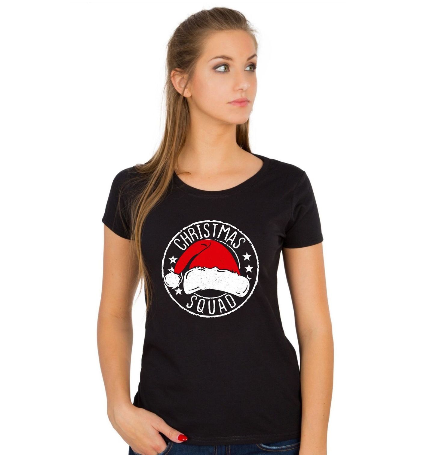 Dámské tričko Vánoční parta Christmas Squad. Originální motiv s červenou Santovou čepicí a nápisem „Christmas Squad“ je ideální pro všechny, kteří chtějí oslavit Vánoce stylově a v partě přátel nebo rodiny. Tento design spojuje sváteční náladu a hravou týmovou energii.