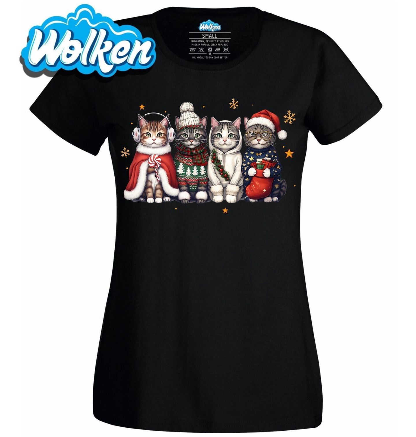 Dámské tričko Vánoční Parta Koček. Čtyři stylové kočky připravené na Vánoce! Tento roztomilý motiv plný sváteční atmosféry spojuje to nejlepší – kočka, Vánoce a trochu módního humoru. Každá kočka má svůj vlastní “ugly” svetr, ale dohromady tvoří dokonale sladěnou partu.