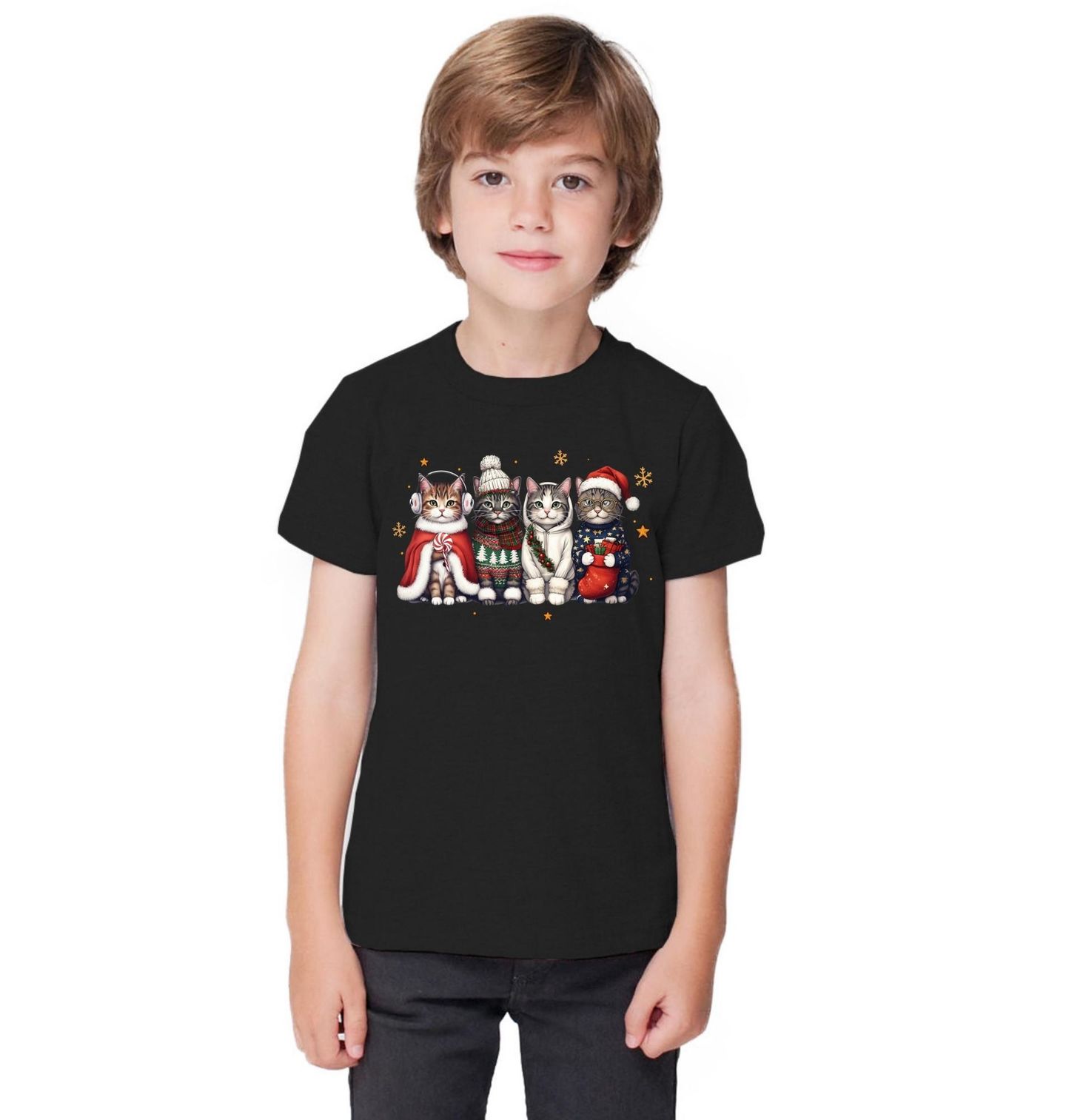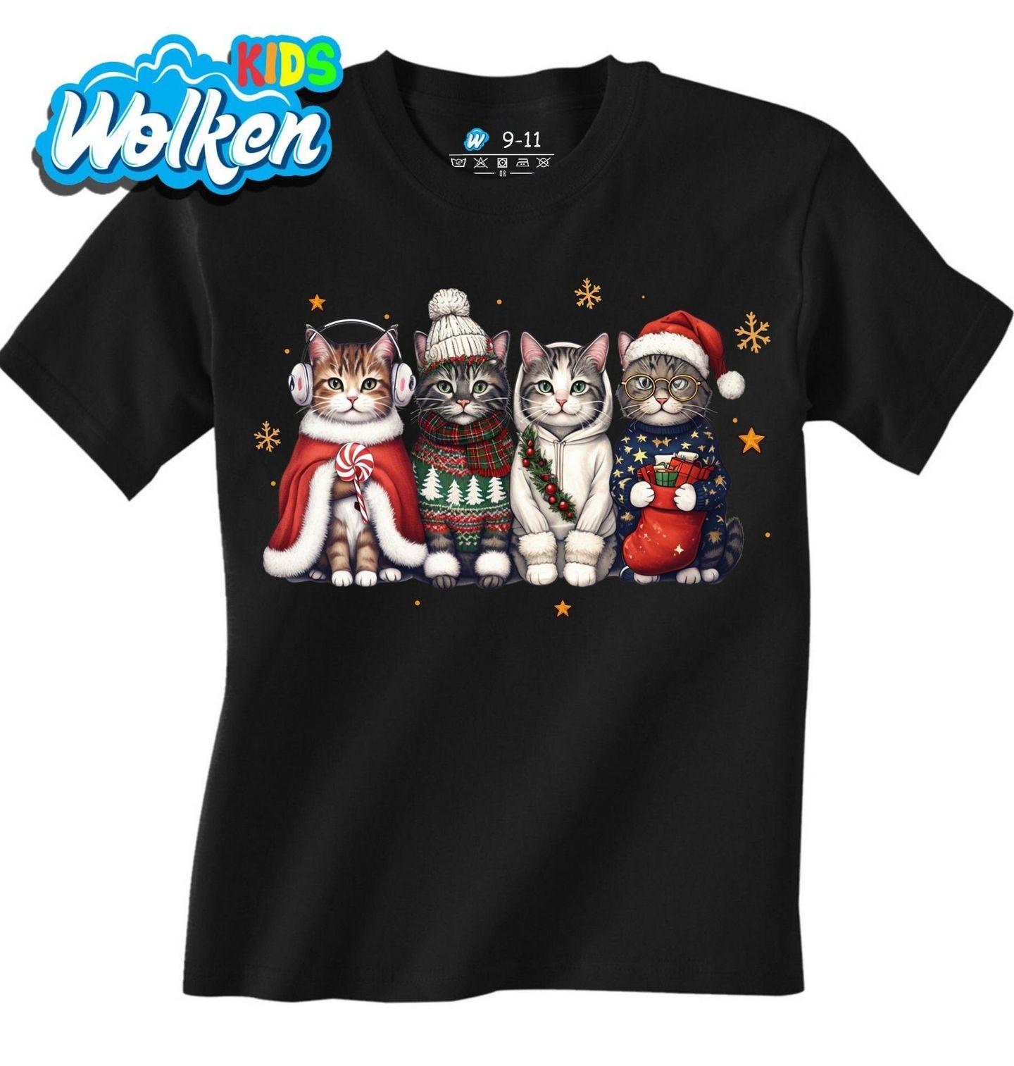 Dětské tričko Vánoční Parta Koček. Čtyři stylové kočky připravené na Vánoce! Tento roztomilý motiv plný sváteční atmosféry spojuje to nejlepší – kočka, Vánoce a trochu módního humoru. Každá kočka má svůj vlastní “ugly” svetr, ale dohromady tvoří dokonale sladěnou partu.