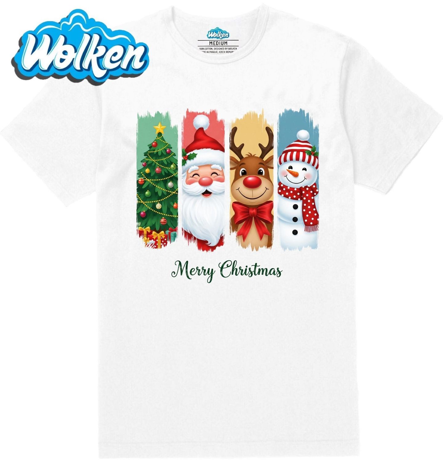 Pánské tričko Vánoční Parta Merry Christmas. Vánoce jako z pohádky! Tento čtyřdílný polyptych přináší sváteční atmosféru v celé své kráse – hlavní roli hrají Vánoce, santa, sob a sněhulák. Každý díl vypráví svůj příběh, dohromady ale tvoří harmonický celek plný radosti, barev a nostalgie.