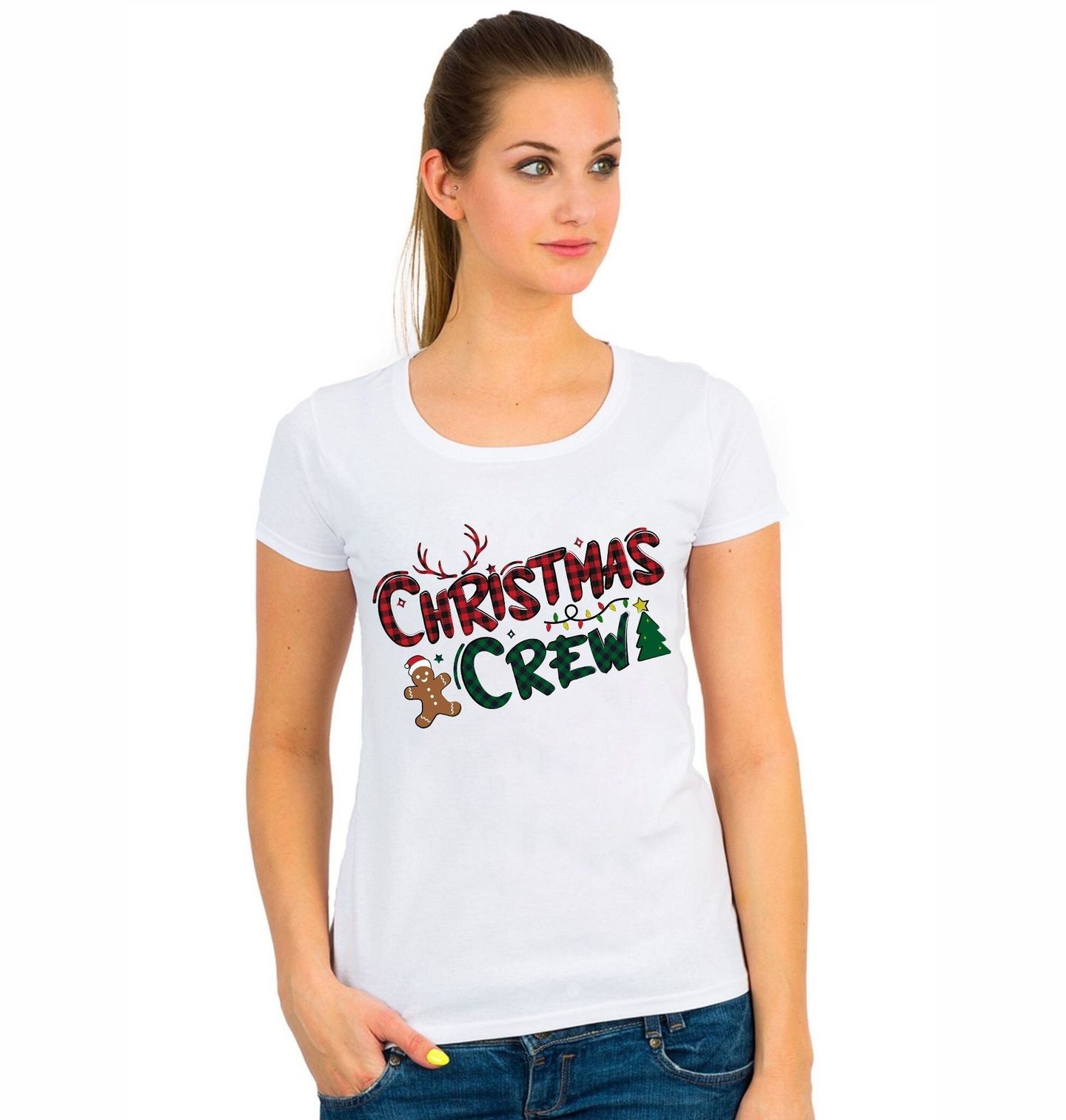 Dámské tričko Vánoční Parta Perníčků Christmas Crew. Tento veselý motiv „Christmas Crew“ je ideální pro všechny, kdo milují společné Vánoce plné smíchu, cukroví a světýlek. Originální design s kostičkovaným vzorem, vánočními světýlky, perníčkem, sobími parohy a vánočním stromečkem dělá z tohoto motivu skvělý doplněk pro celou partu.