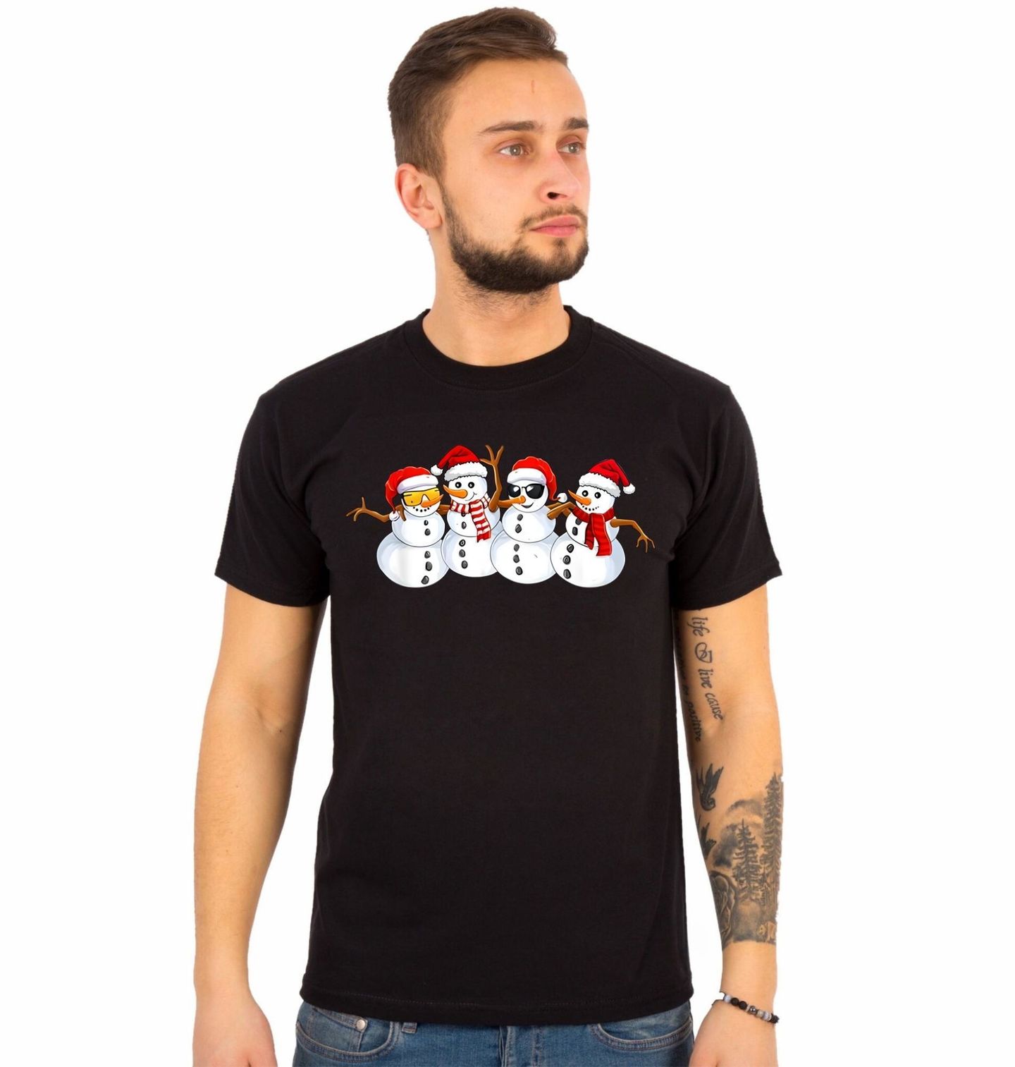 Pánské tričko Vánoční Parta Sněhuláků. Tento veselý motiv ukazuje čtyři sněhuláky ve vánočních čepicích a šálách, kteří se objímají a baví jako ta nejlepší parta. Vánoce se sněhuláky přinášejí spoustu radosti, legrace a té pravé zimní atmosféry.