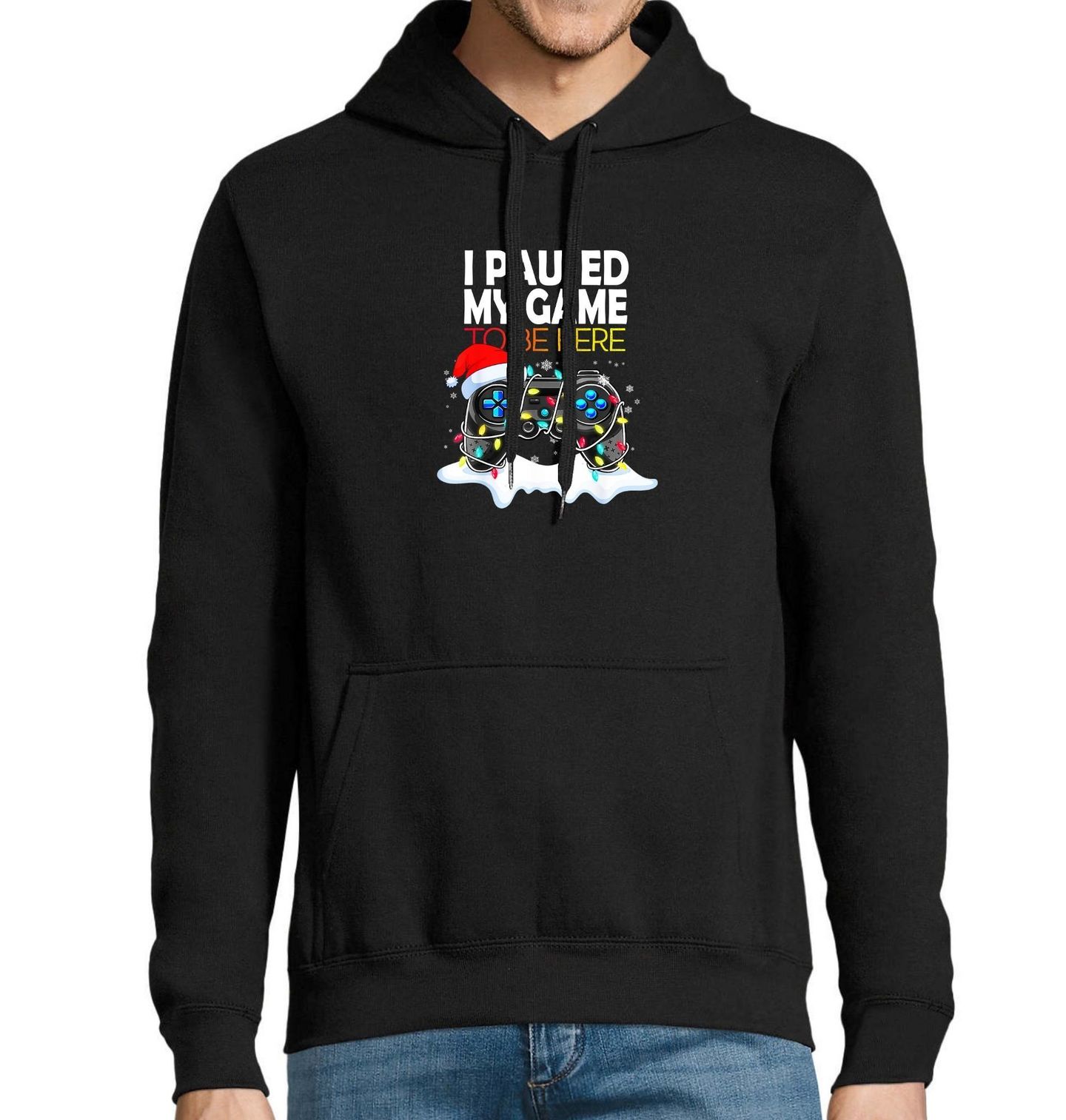 Pánská mikina Vánoční Pauza Hráče. "I PAUSED MY GAME TO BE HERE" = „Pozastavil jsem svou hru, abych tu byl“. Hravý vánoční motiv, který okamžitě pochopí každý opravdový hráč. Herní ovladač ozdobený světýlky, zasazený do sněhu a s vánoční čepicí, dokonale vystihuje, co znamená spojení gaming a Vánoce.