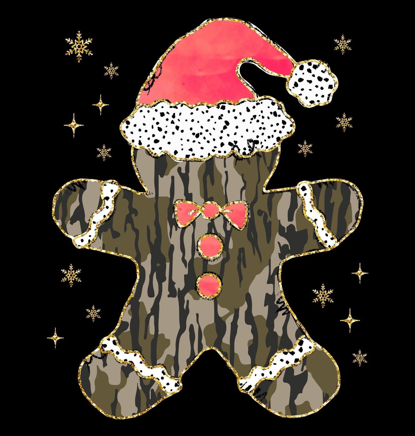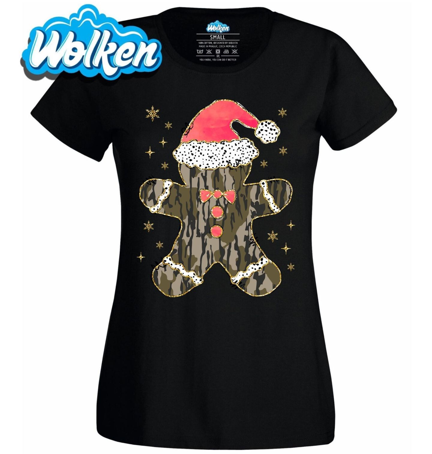 Dámské tričko Vánoční Perníček. Perníková postavička je doplněna o červenou čepici a knoflíky, což jí dodává nezaměnitelný vánoční nádech. Tento jedinečný styl je ideální pro ty, kteří chtějí oslavit Vánoce s humorem a v neokoukaném provedení. Motiv je doplněn třpytivými hvězdičkami a vločkami pro dokonalou sváteční atmosféru.