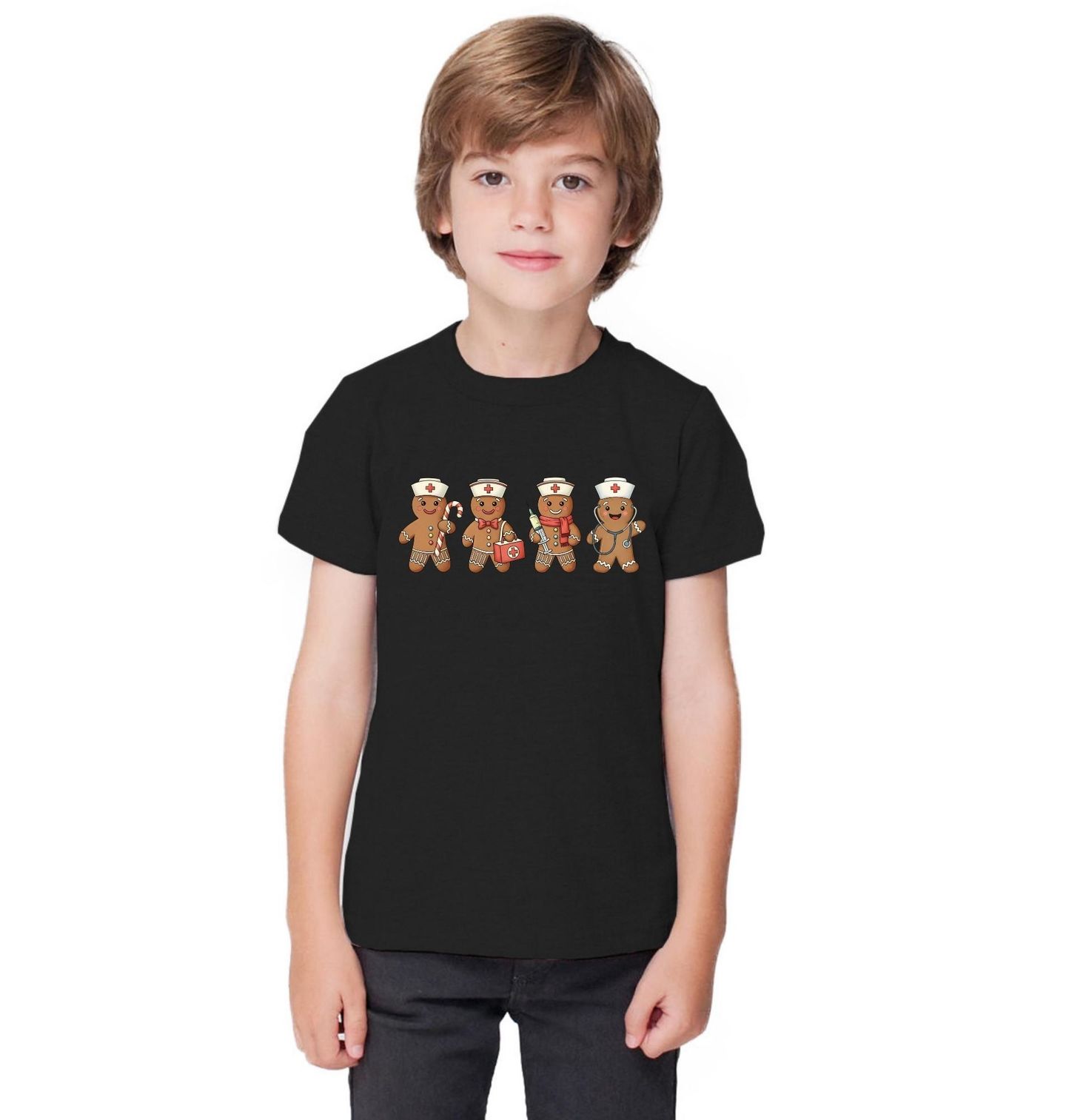 Dětské tričko Vánoční Perníčkový Tým Lékařů. Čtyři usměvaví perníčci v kostýmech zdravotníků – lékařů, sester a doktorů – připraveni pečovat o zdraví, ale i o sváteční atmosféru. Tento originální design kombinuje Vánoce, perníček a zdravotnictví a je ideální jako vtipný i milý dárek.