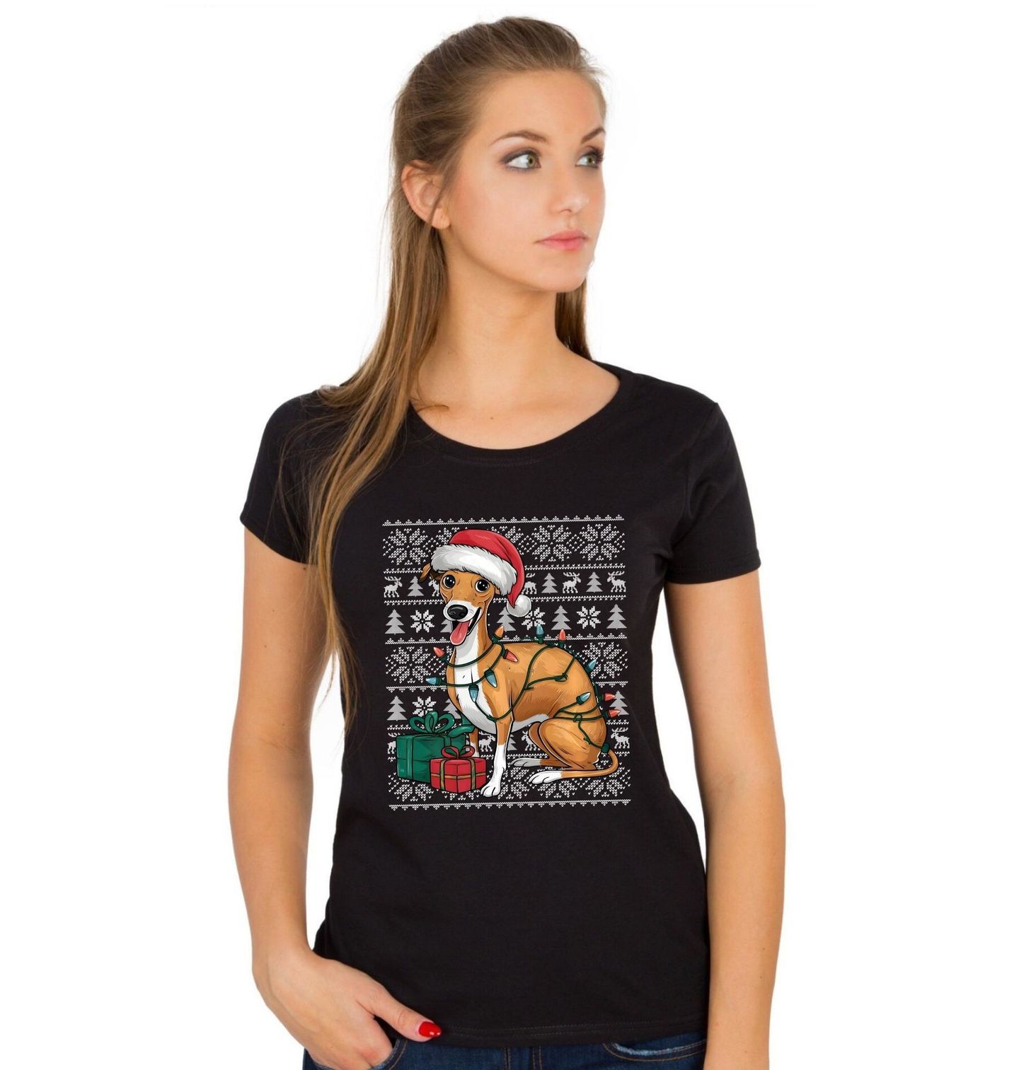 Dámské tričko Vánoční Pes Whippet. Udělejte si Vánoce ještě veselejší s tímto originálním motivem „ugly sweater“, který potěší každého pejskaře. Veselý pes plemene whippet (chrt) v santa čepici, obmotaný vánočními světýlky a obklopený dárky, přináší sváteční pohodu i pořádnou dávku humoru.