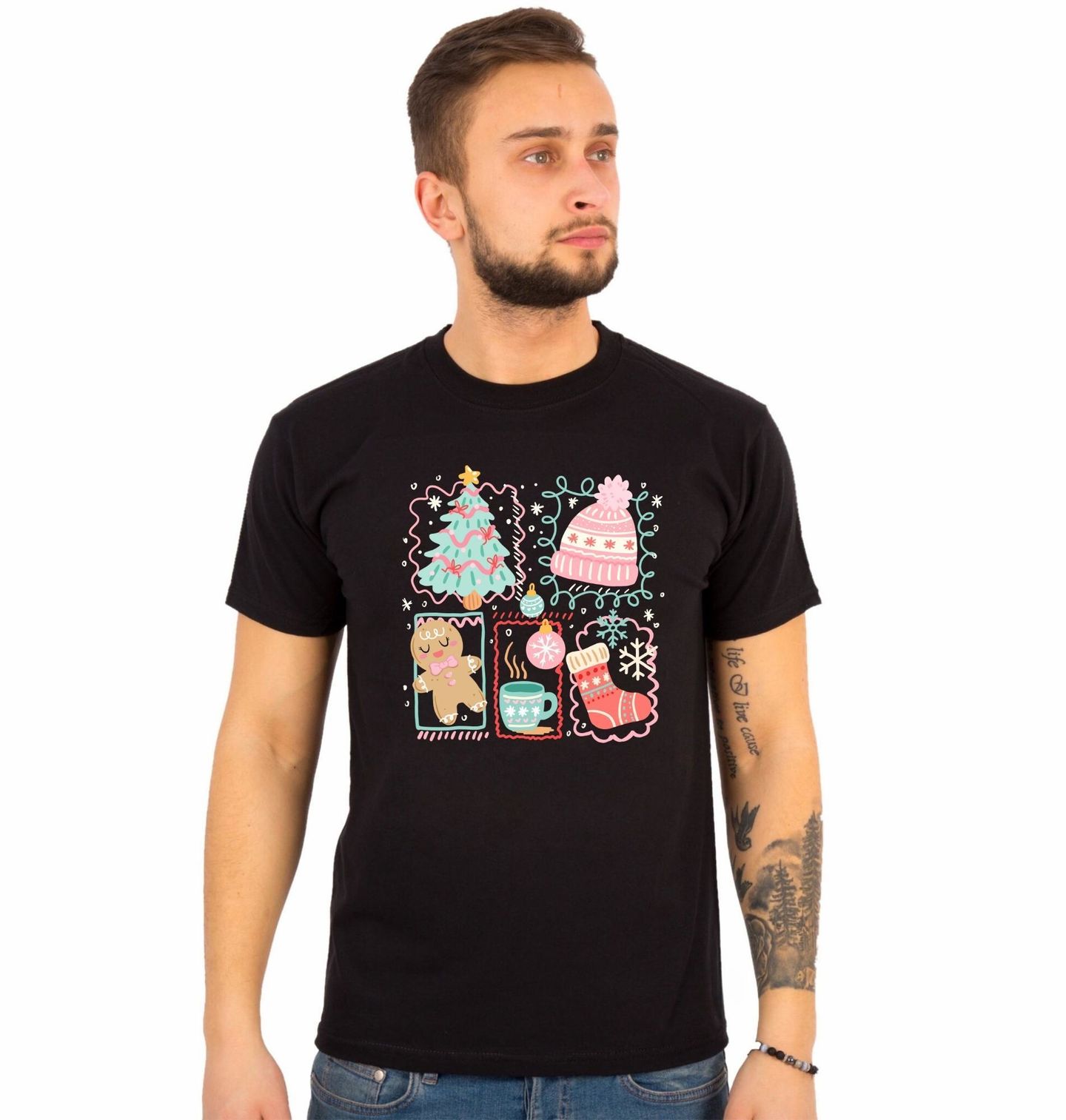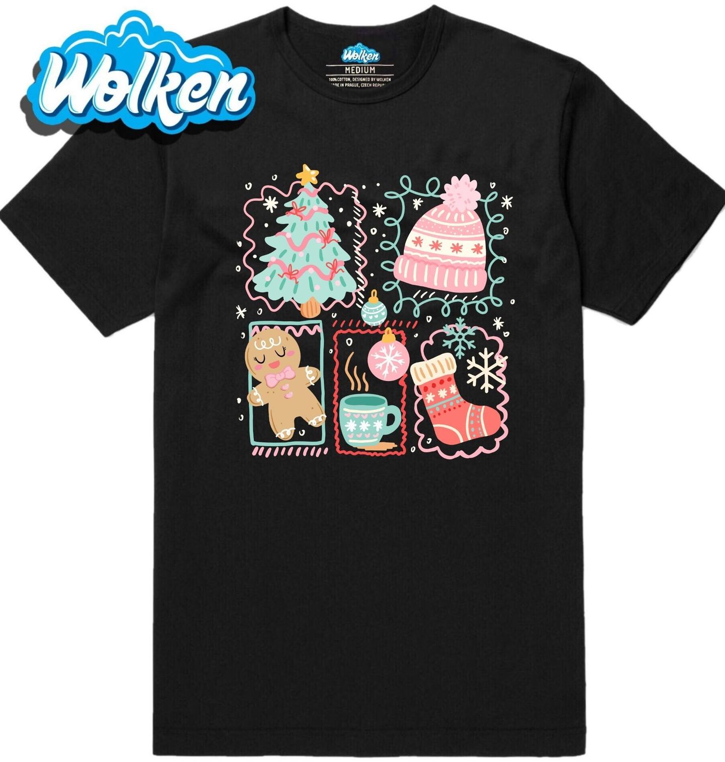 Pánské tričko Vánoční Pohoda. Roztomilý, barevný a hřejivý motiv, který zachycuje to nejlepší, co přinášejí Vánoce – ozdobený stromeček, usměvavý perníček, horká káva, čepice, punčocha i vánoční ozdoby. Tohle je dokonalý design pro všechny, kdo milují sváteční pohodu, vůni cukroví a teplý hrnek v dlaníc
