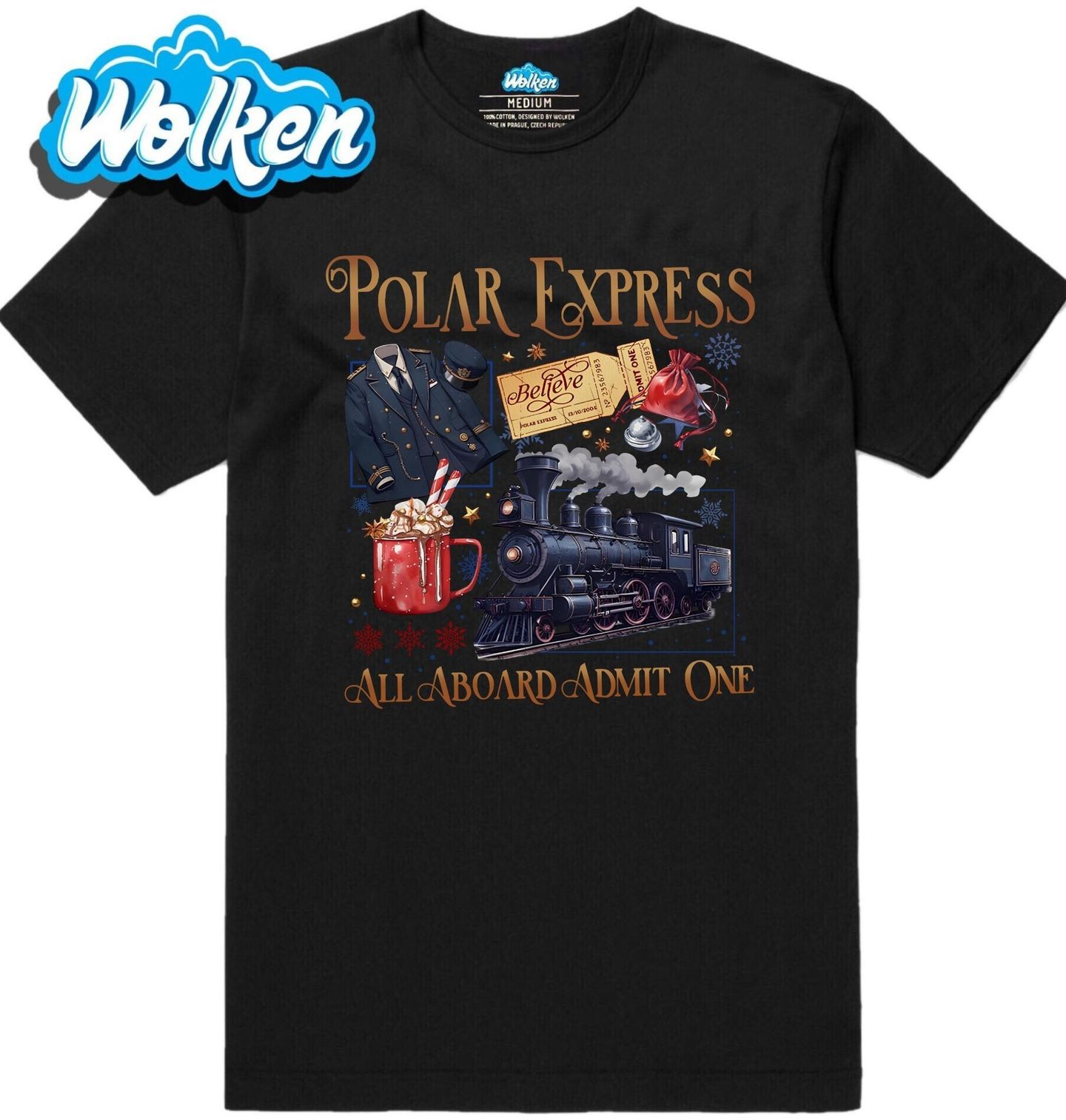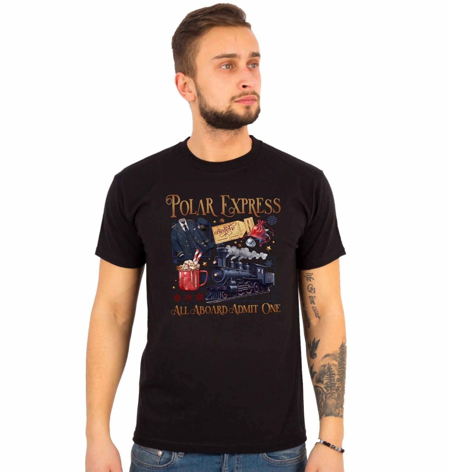 Pánské tričko Vánoční Polární expres. Motiv inspirovaný slavnou vánoční pohádkou Polární expres, který ukazuje vlak jedoucí zasněženou krajinou a připomíná cestu na Severní pól. Na obrázku je vlak, ikonický lístek „Believe“, vánoční zvoneček, uniforma průvodčího i hrnek horké čokolády. Ideální pro všechny, kdo milují Vánoce.