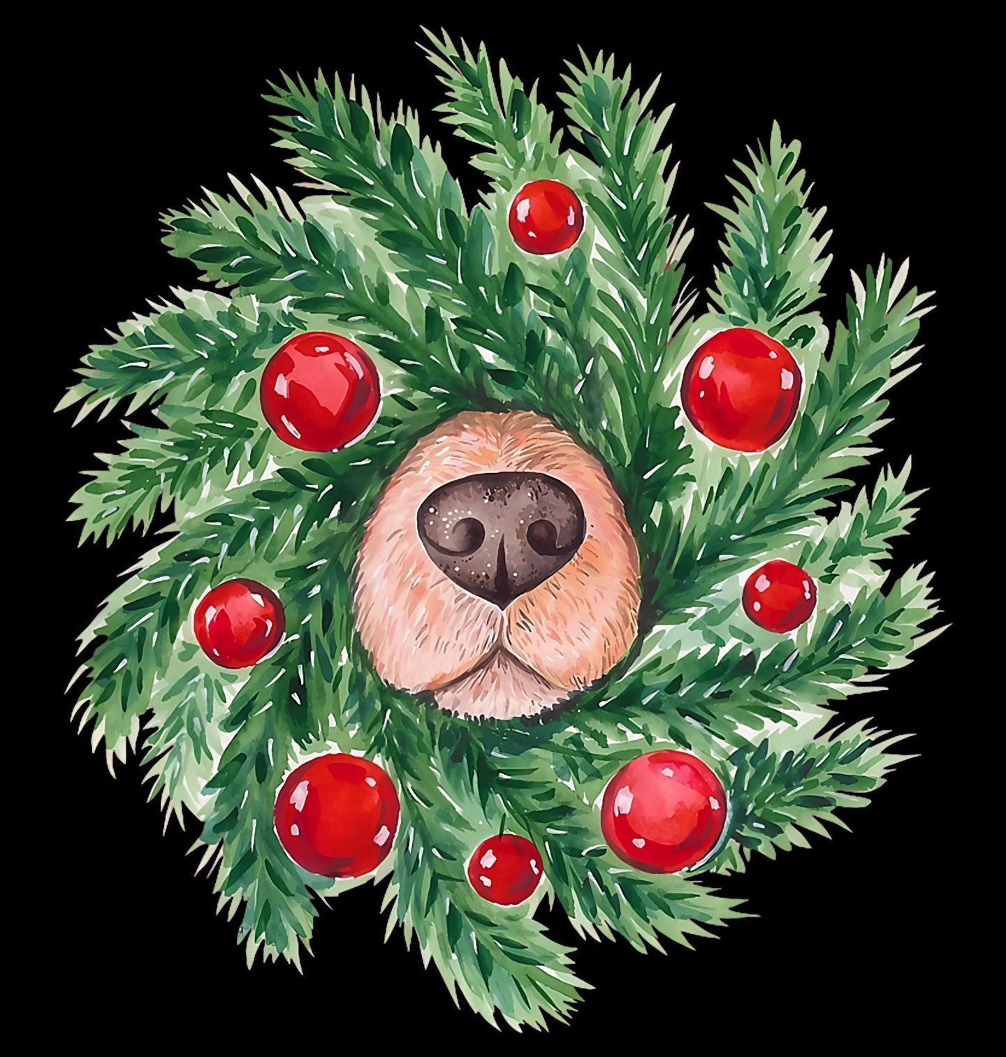 Dámské tričko Vánoční Psí Věnec. Vánoce jsou tu a s nimi i originální motiv pro všechny milovníky psů! Tento veselý design zobrazuje psí čumák a nos plemene labrador ukrytý uprostřed vánočního věnce ozdobeného větvičkami a červenými baňkami. Ideální dárek pro každého pejskaře, kterému je pes přítelem.