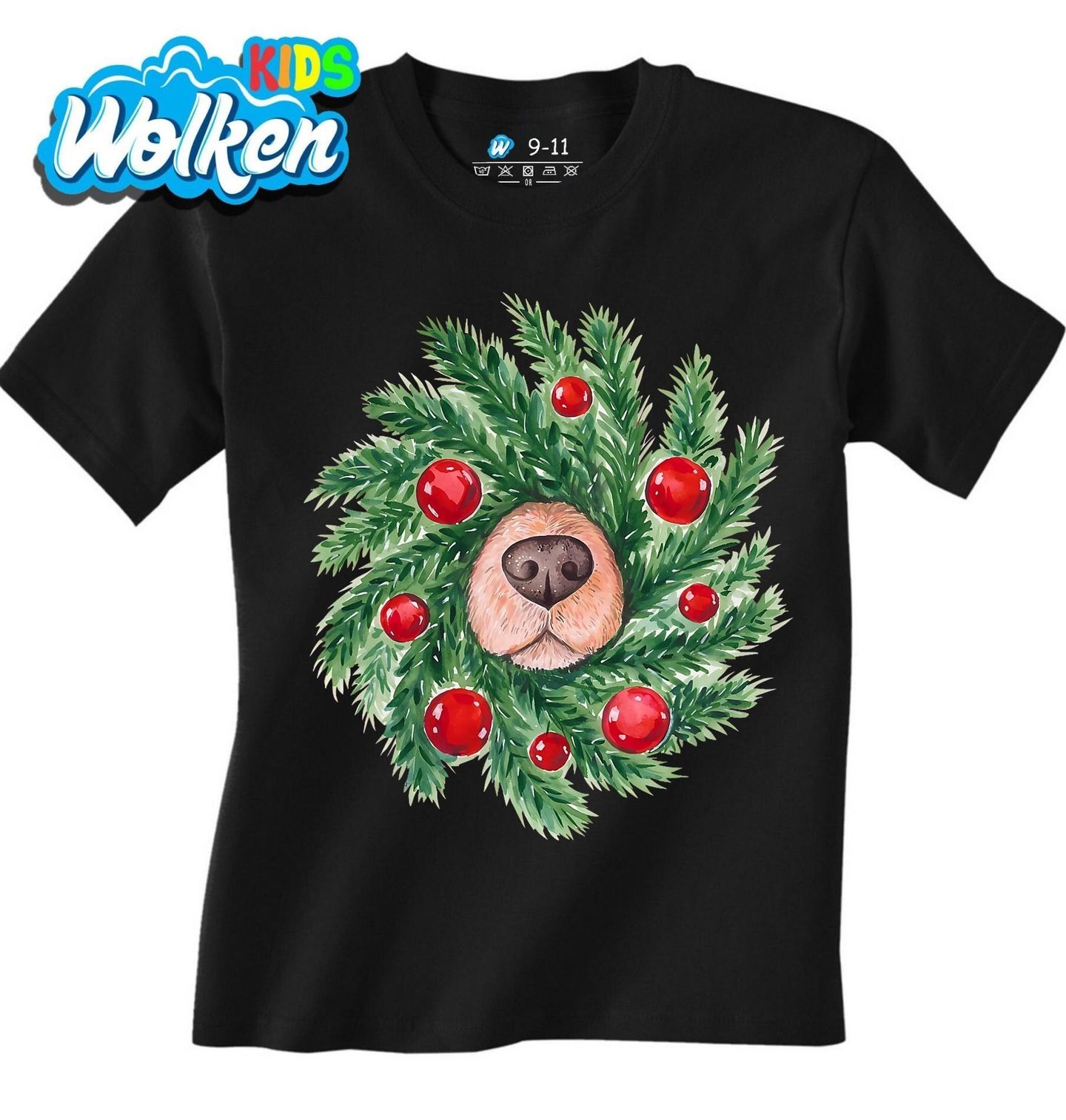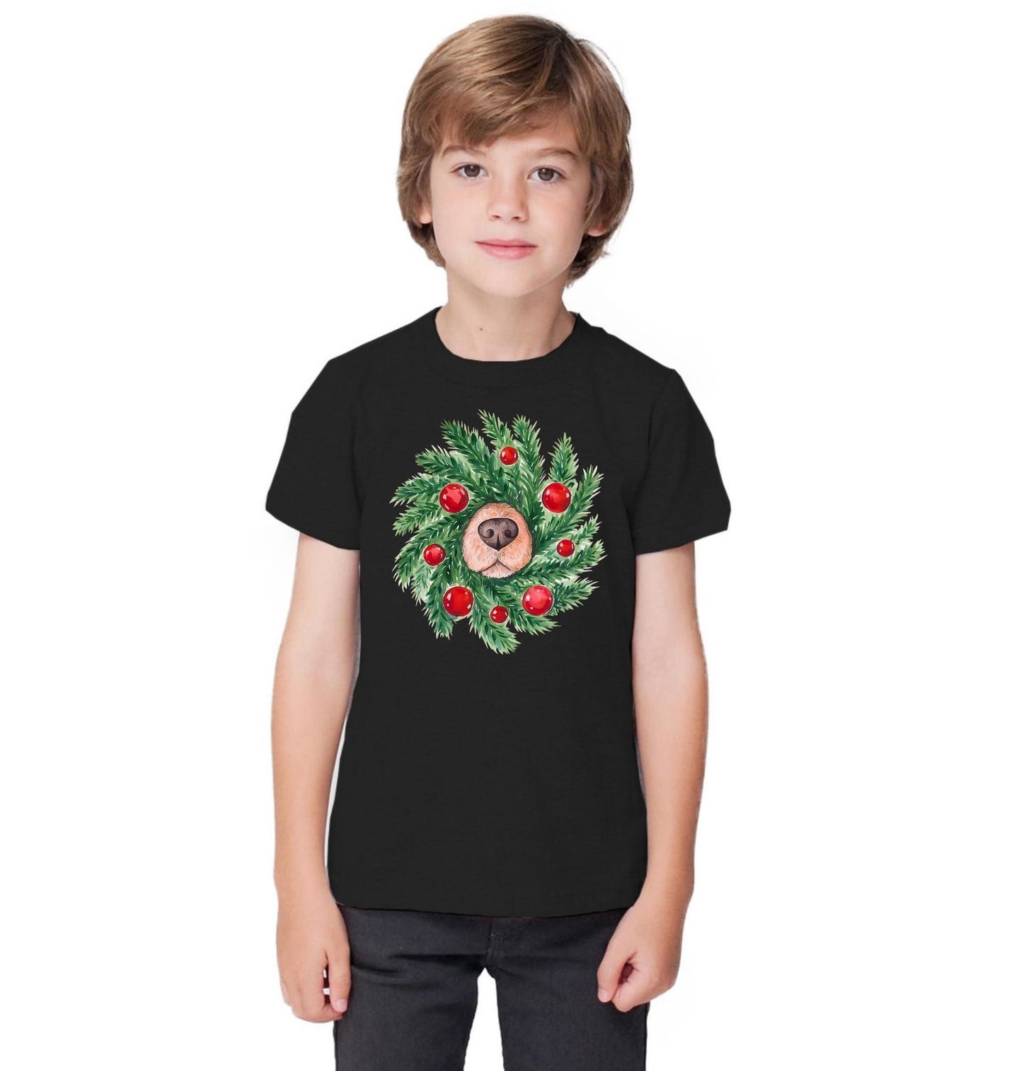 Dětské tričko Vánoční Psí Věnec. Vánoce jsou tu a s nimi i originální motiv pro všechny milovníky psů! Tento veselý design zobrazuje psí čumák a nos plemene labrador ukrytý uprostřed vánočního věnce ozdobeného větvičkami a červenými baňkami. Ideální dárek pro každého pejskaře, kterému je pes přítelem.