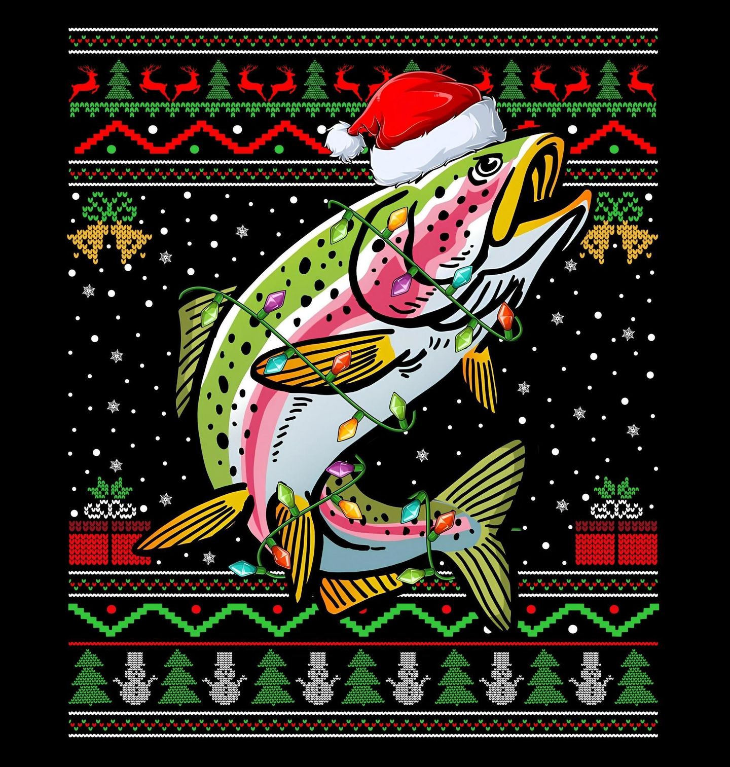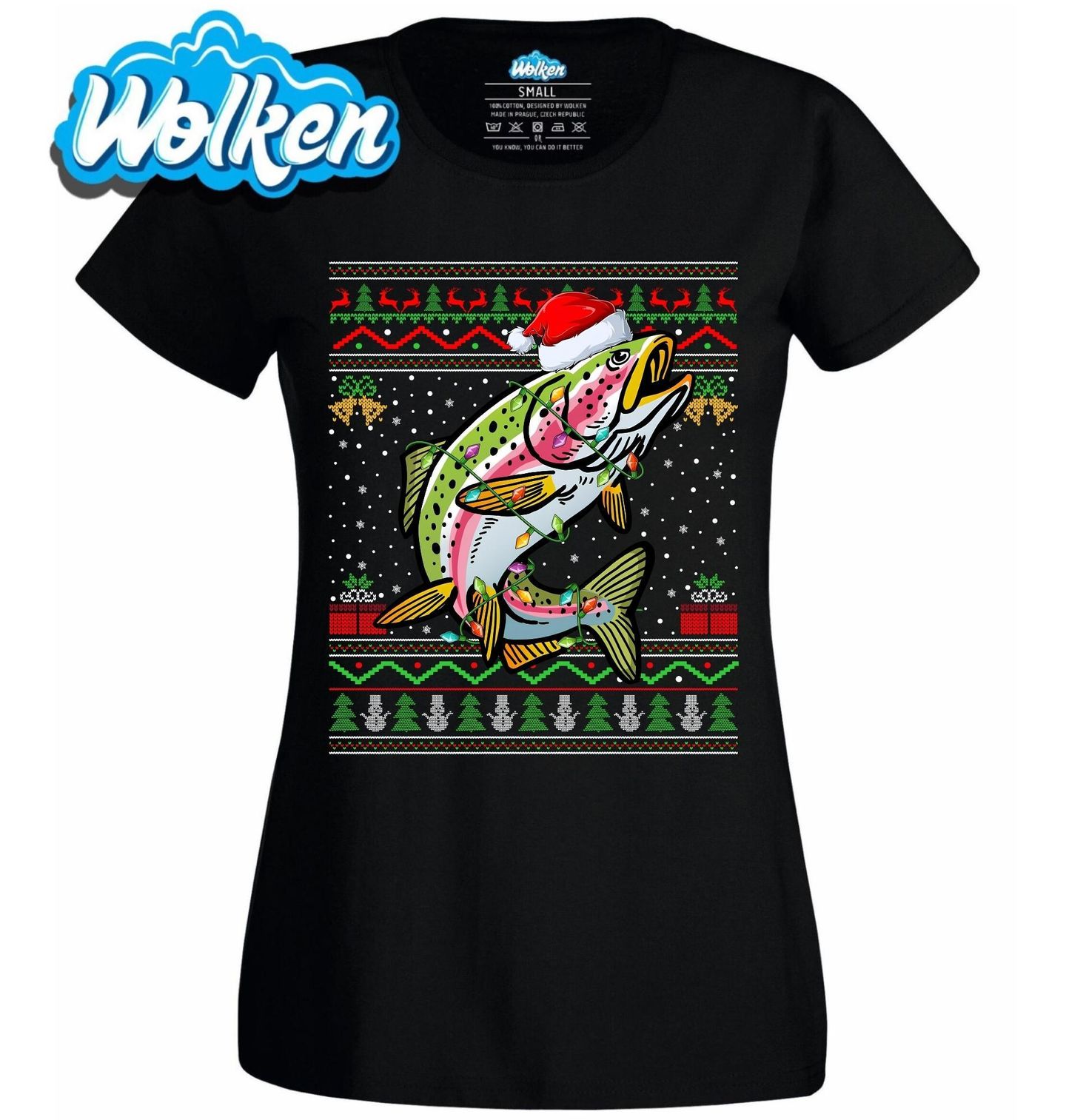 Dámské tričko Vánoční Pstruh duhový. Tento originální motiv „ugly sweater“ s vánoční rybou je perfektní volbou pro každého, koho baví rybaření a miluje Vánoce. Barevný prstruh omotaný světýlky v kombinaci s vánoční čepicí a sněhovou kulisou vytvoří úsměv na tváři každému rybáři.