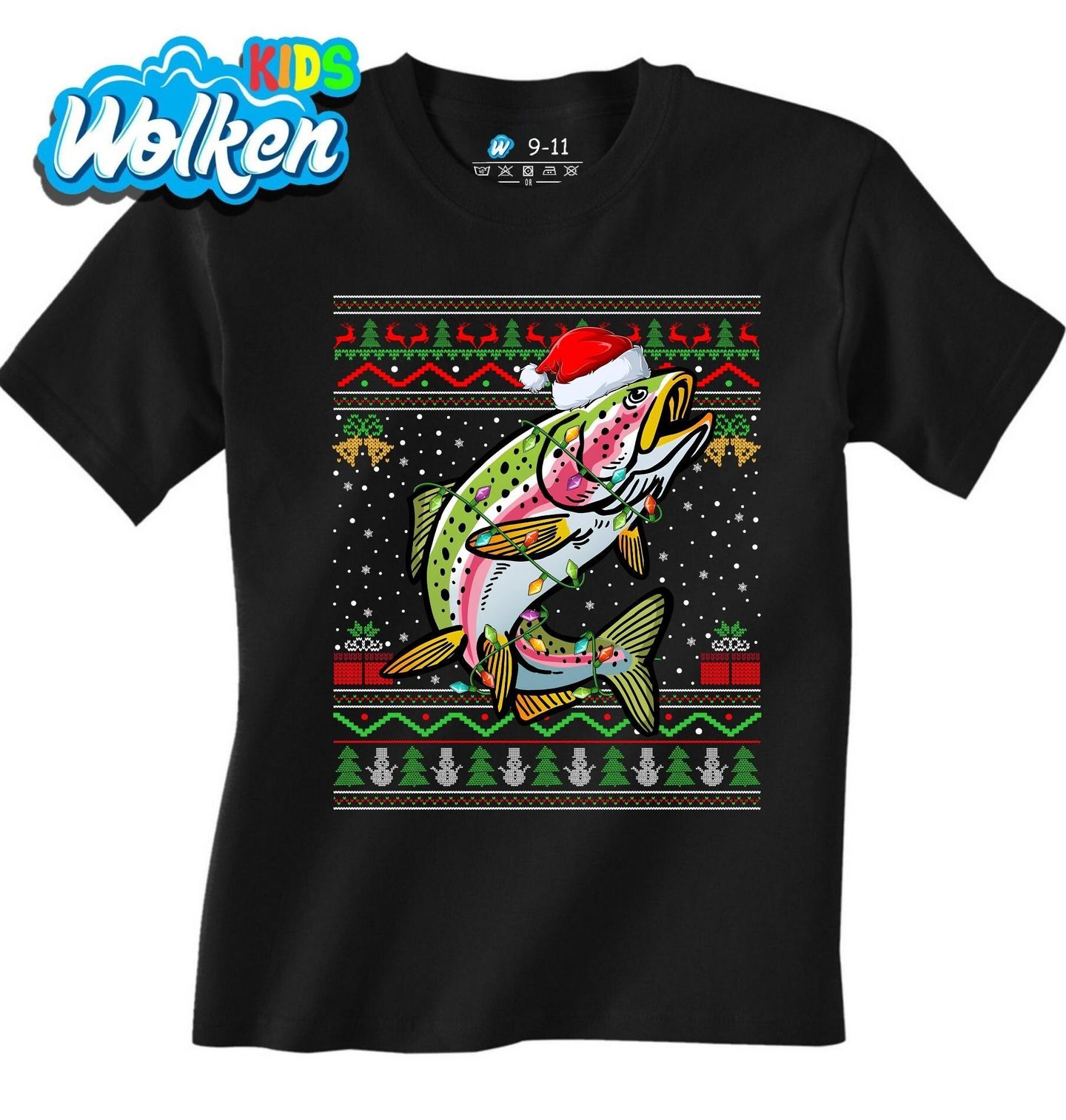Dětské tričko Vánoční Pstruh duhový. Tento originální motiv „ugly sweater“ s vánoční rybou je perfektní volbou pro každého, koho baví rybaření a miluje Vánoce. Barevný prstruh omotaný světýlky v kombinaci s vánoční čepicí a sněhovou kulisou vytvoří úsměv na tváři každému rybáři.