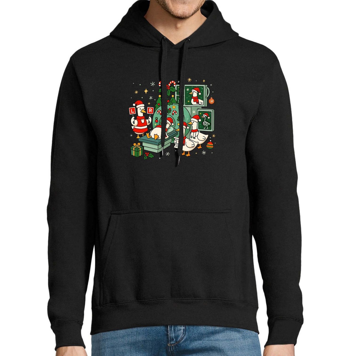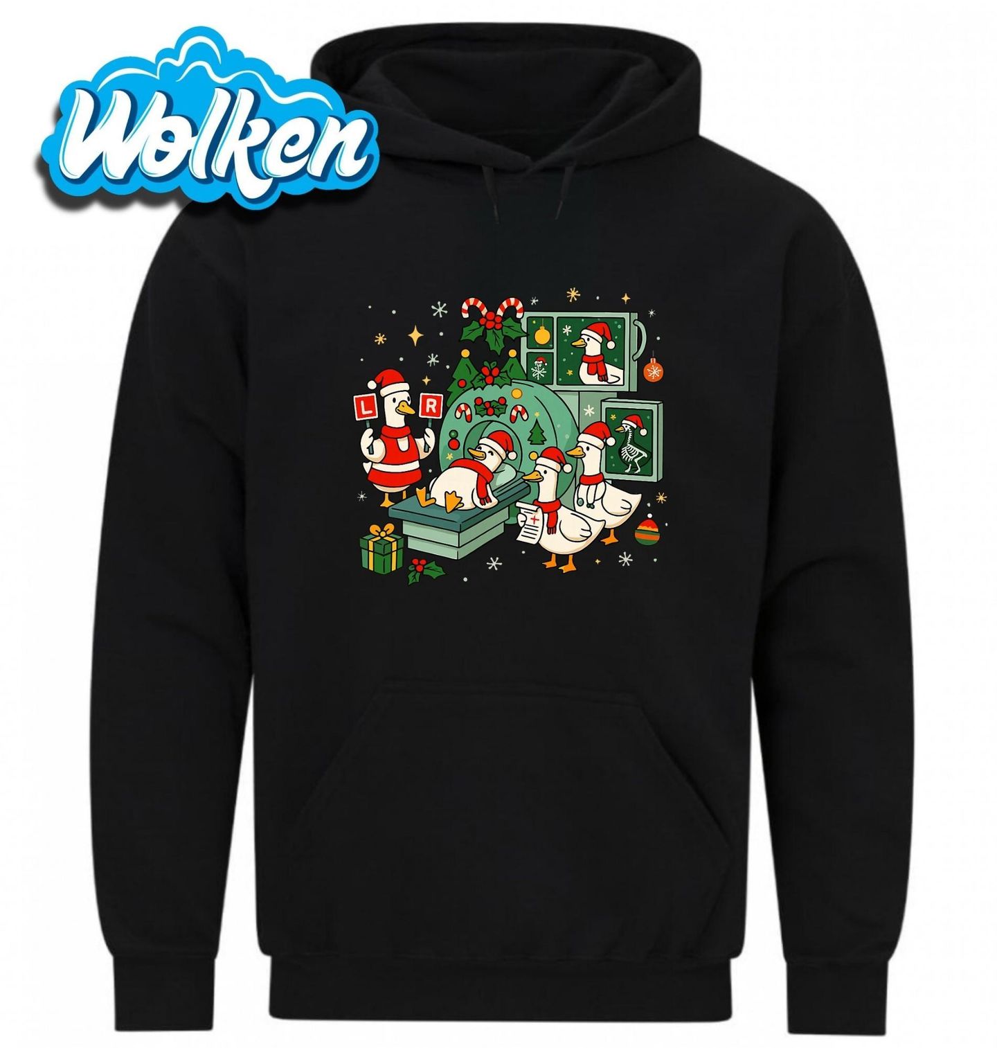 Pánská mikina Vánoční Rentgen Husy. Tato vánočně laděná husa se ocitla ve světě zdravotnictví, kde podstupuje moderní rentgen v přítomnosti dalších veselých husích doktorů. Celá scéna je plná svátečních prvků – cukrové třtiny, vánoční čepičky, světýlka a ozdoby. Stylový a vtipný motiv pro lékaře, kteří milují Vánoce.