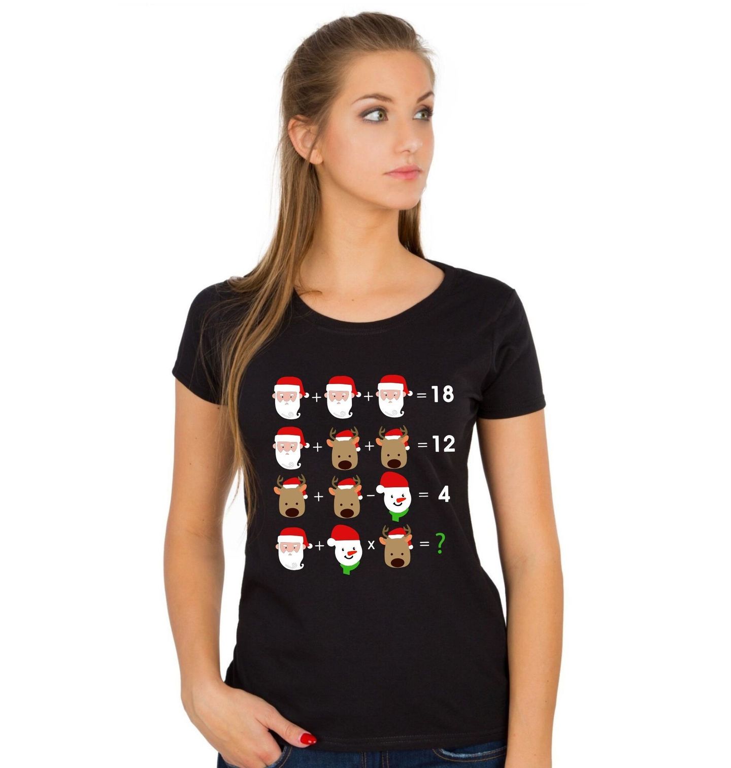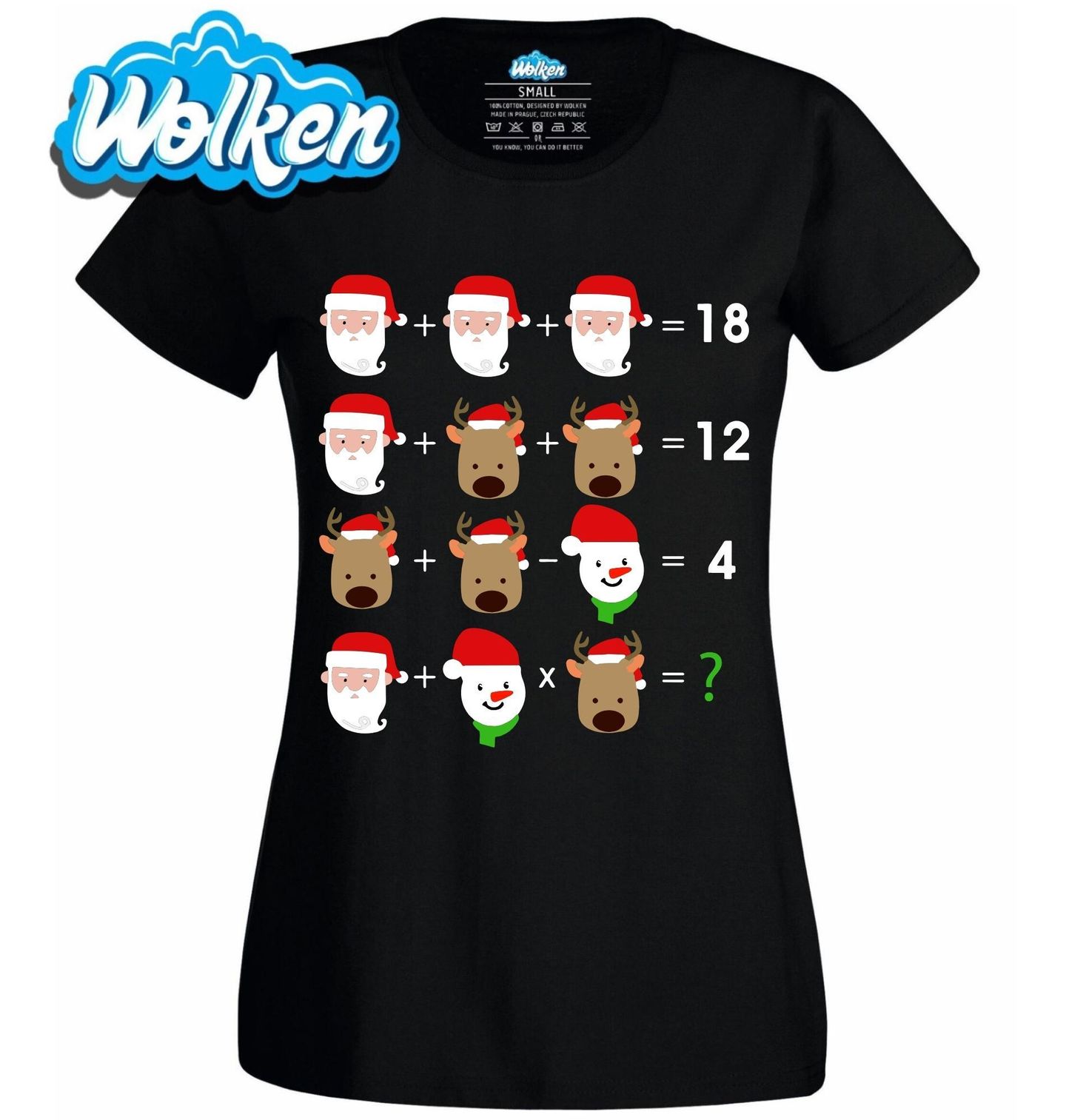 Dámské tričko Vánoční Rovnice. Zábavný a originální motiv, který spojuje Vánoce, Santu, soba, sněhuláka a matematiku do jedné vizuální hádanky! Ideální pro každého, kdo miluje Vánoce a rád si láme hlavu. Tento design je skvělý jako dárek pro děti, učitele i fanoušky logických úloh, spočítej kolik je Santa!