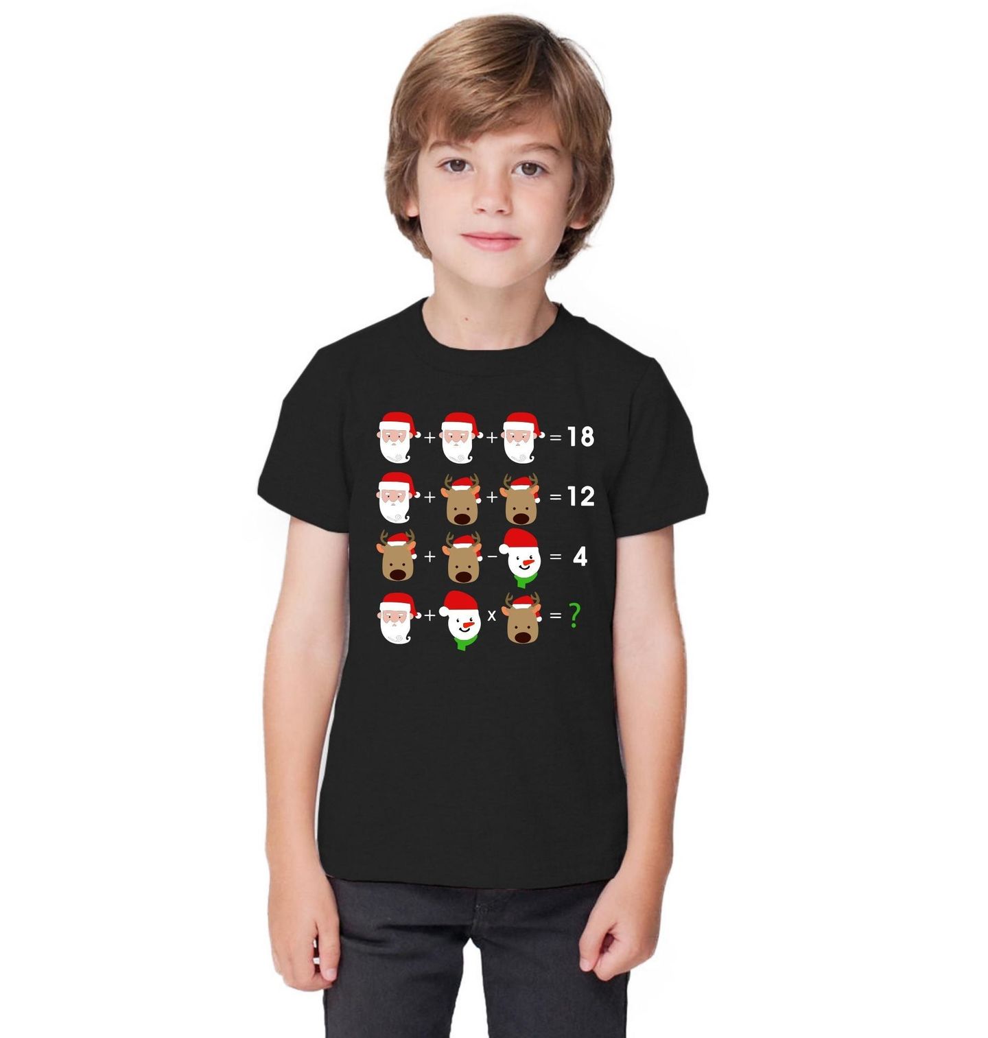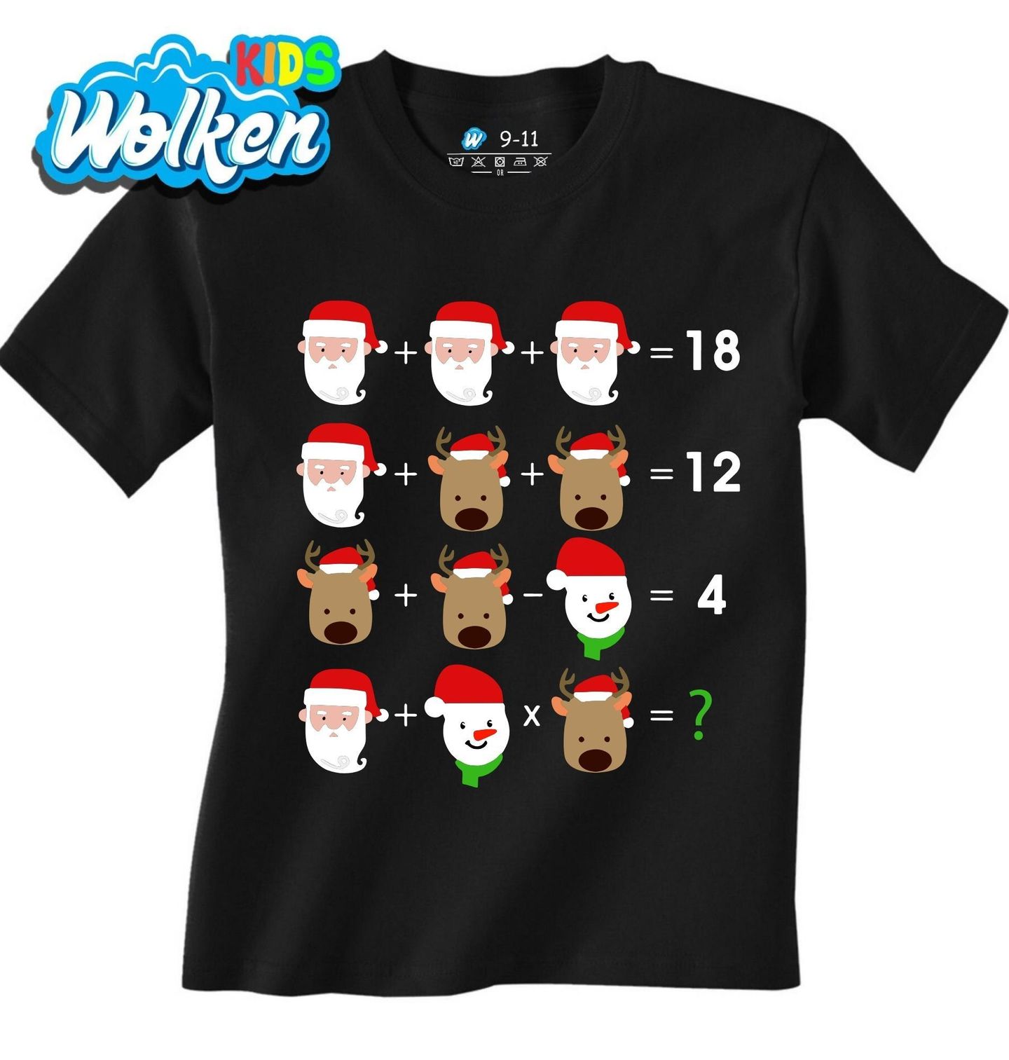 Dětské tričko Vánoční Rovnice. Zábavný a originální motiv, který spojuje Vánoce, Santu, soba, sněhuláka a matematiku do jedné vizuální hádanky! Ideální pro každého, kdo miluje Vánoce a rád si láme hlavu. Tento design je skvělý jako dárek pro děti, učitele i fanoušky logických úloh, spočítej kolik je Santa!