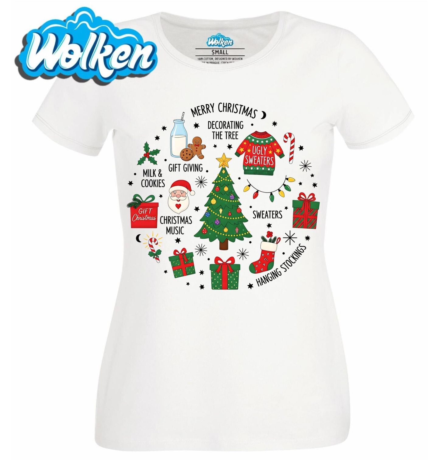 Dámské tričko Vánoční Rutina. Roztomilý a barevný motiv pro všechny milovníky sváteční atmosféry! Tento originální design zachycuje ikonické momenty, bez kterých si Vánoce prostě neumíme představit – vánoční stromeček, dárky, cukroví, punčochy, světýlka, Santa Claus, a samozřejmě slavné „ugly sweaters“.