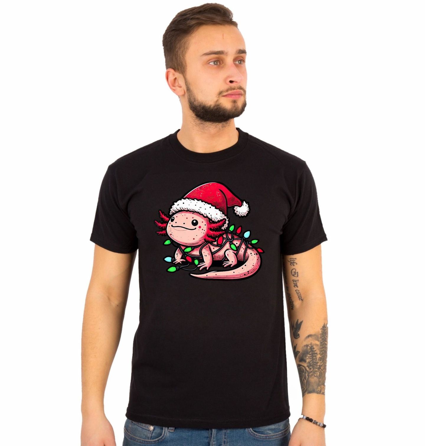 Pánské tričko Vánoční Růžový Axolotl. Axolotl je symbolem roztomilosti a originality, a proto se tento motiv skvěle hodí jako dárek pro každého, kdo má rád neobvyklá zvířata a sváteční pohodu. Vánoce s axolotlem vám vykouzlí úsměv na tváři i v těch nejchladnějších dnech.