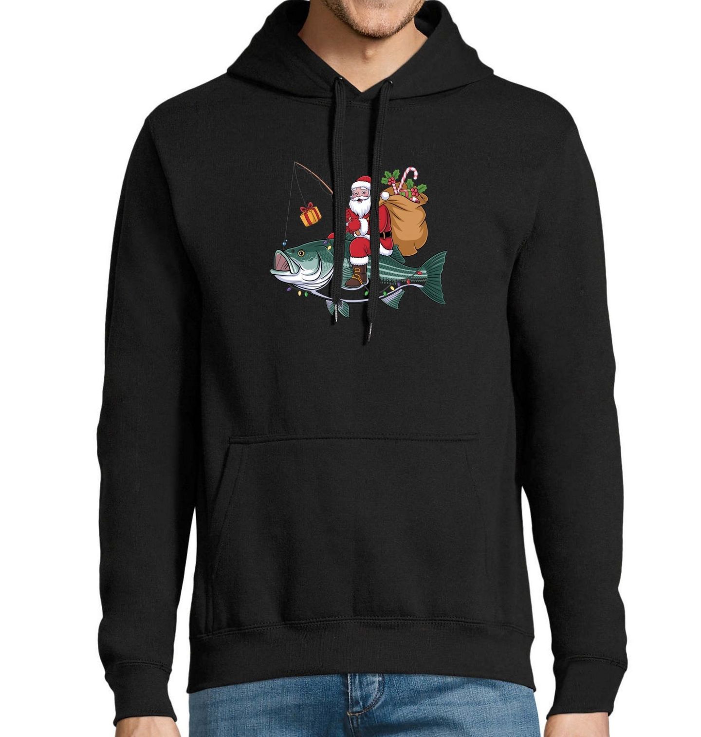 Pánská mikina Vánoční Rybář Santa. Připravte se na Vánoce s humorem a stylem! Tento originální motiv Santa rybáře, který jede na obrovské rybě a rozdává dárky, potěší každého, kdo miluje rybaření. Spojení vánoční atmosféry, svátečních světýlek a oblíbeného koníčku dělá z tohoto designu ideální dárek pro každého rybáře.