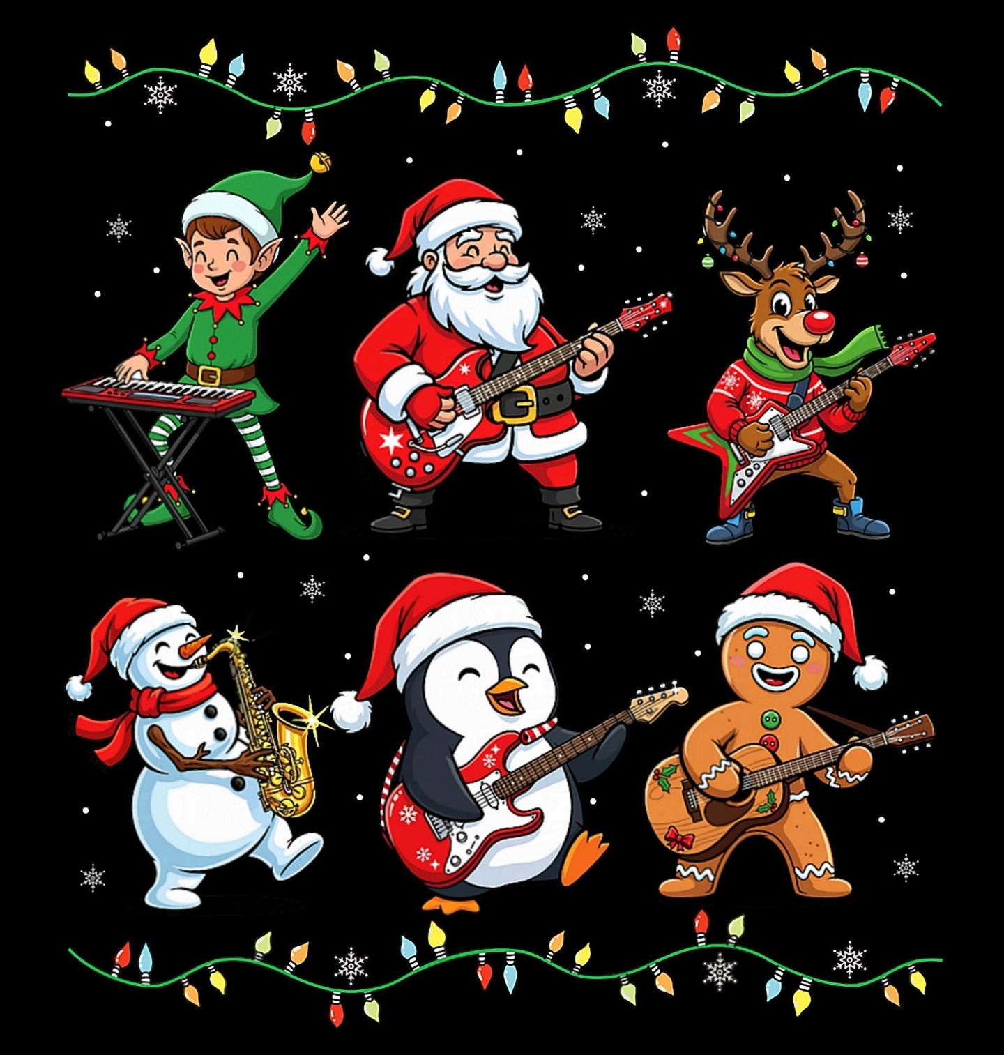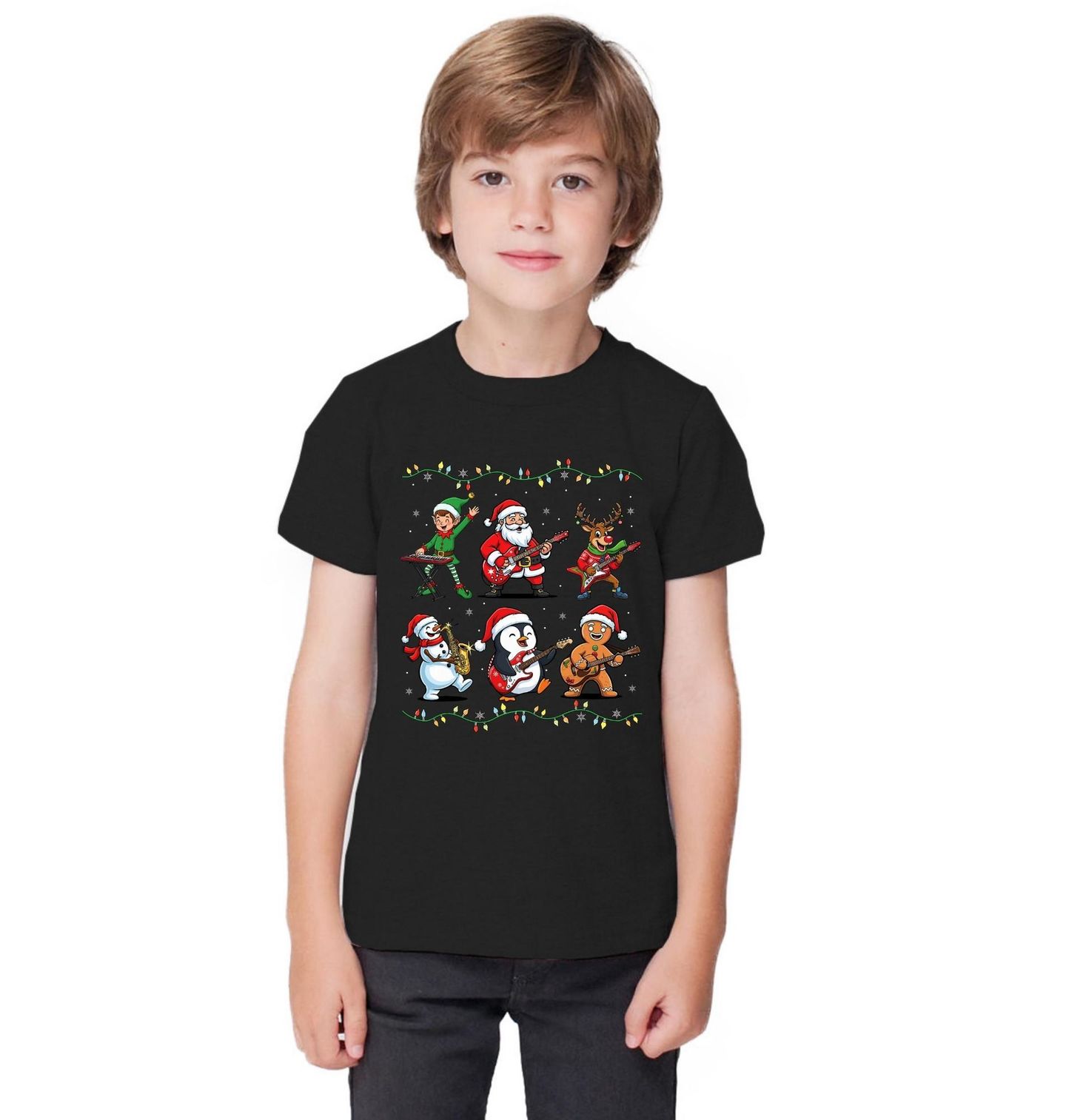 Dětské tričko Vánoční Santova Kapela. Zažij nezapomenutelné Vánoce plné hudby a zábavy s tímto originálním potiskem! Tento motiv zachycuje sváteční kapelu složenou z oblíbených postaviček:Santa Claus s elektrickou kytarou, Elf hrající na klávesy, Sněhulák s vánočním saxofonem, Tučňák s elektrickou kytarou, Perníček s akustickou kytarou a Sob s rockovou kytarou.