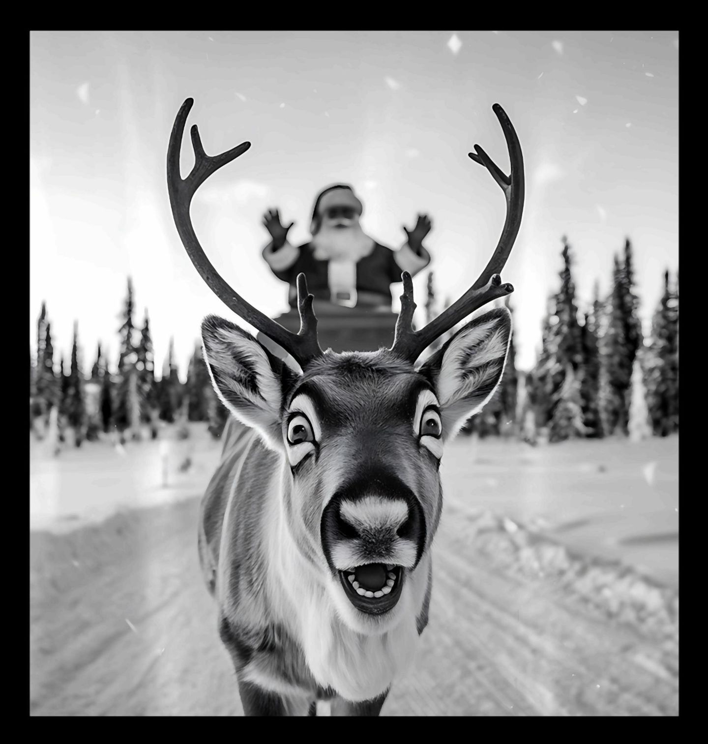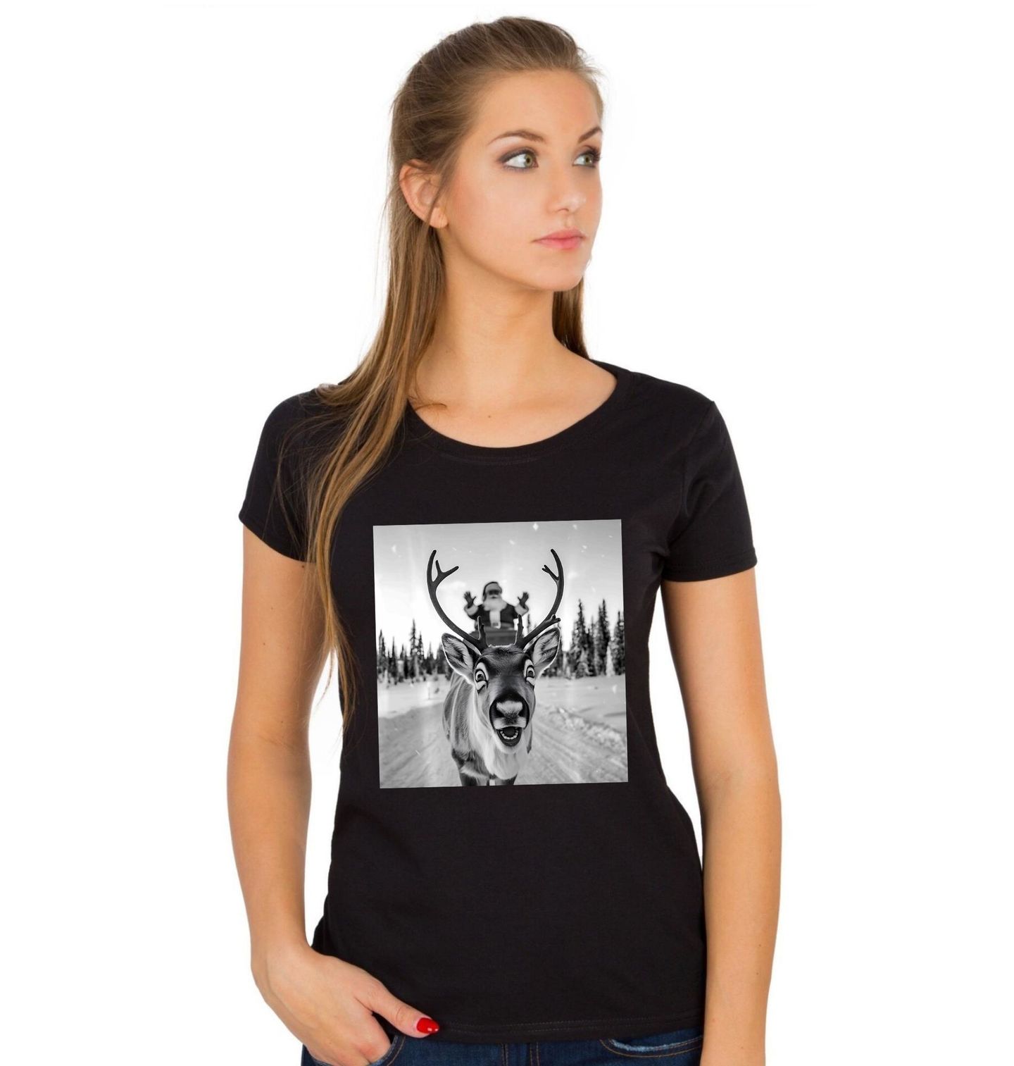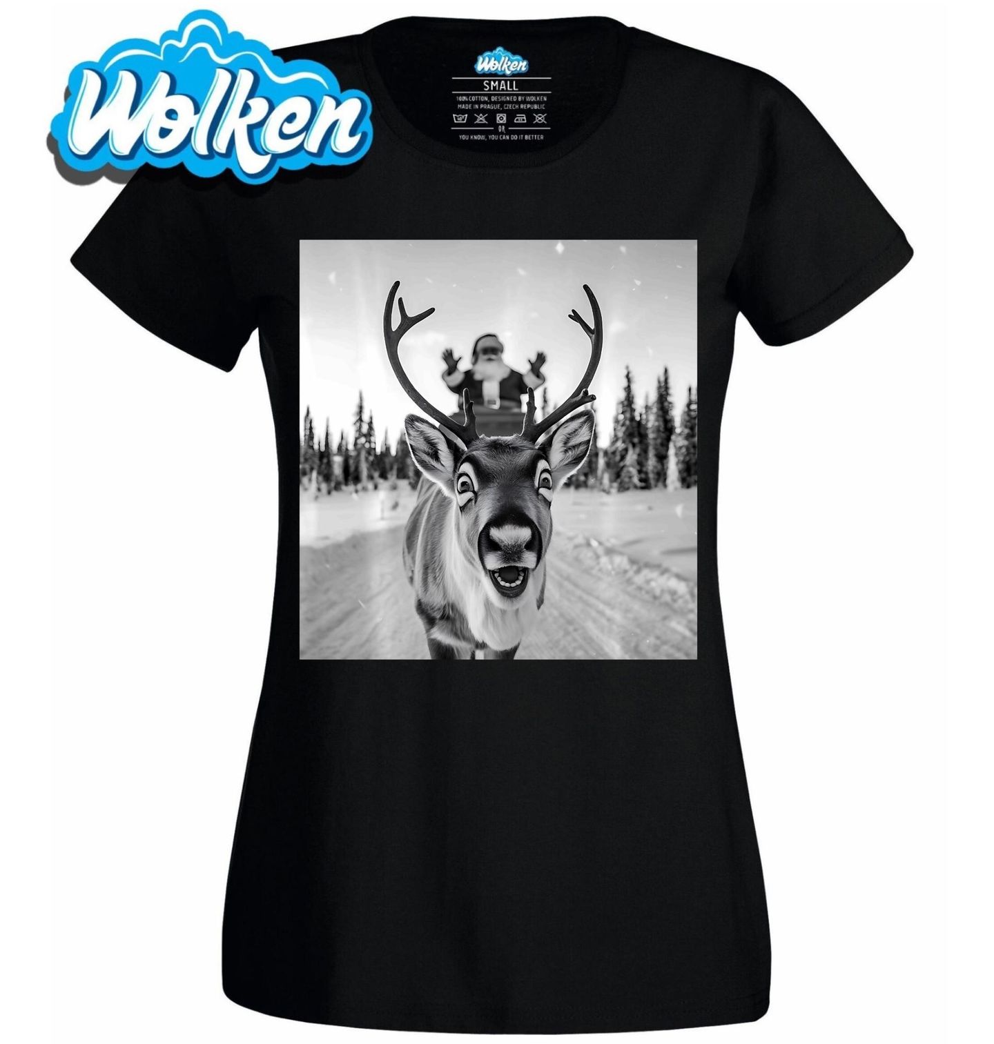 Dámské tričko Vánoční Selfie Soba se Santou. Rozveselte Vánoce originálním motivem, který spojuje sobí energii a vánoční kouzlo! V popředí je nadšený sob, který si dělá vtipné selfie, zatímco Santa Claus sedí v saních a mává. Tento hravý design je ideální pro všechny, kteří milují humor, zvířata a sváteční atmosféru.