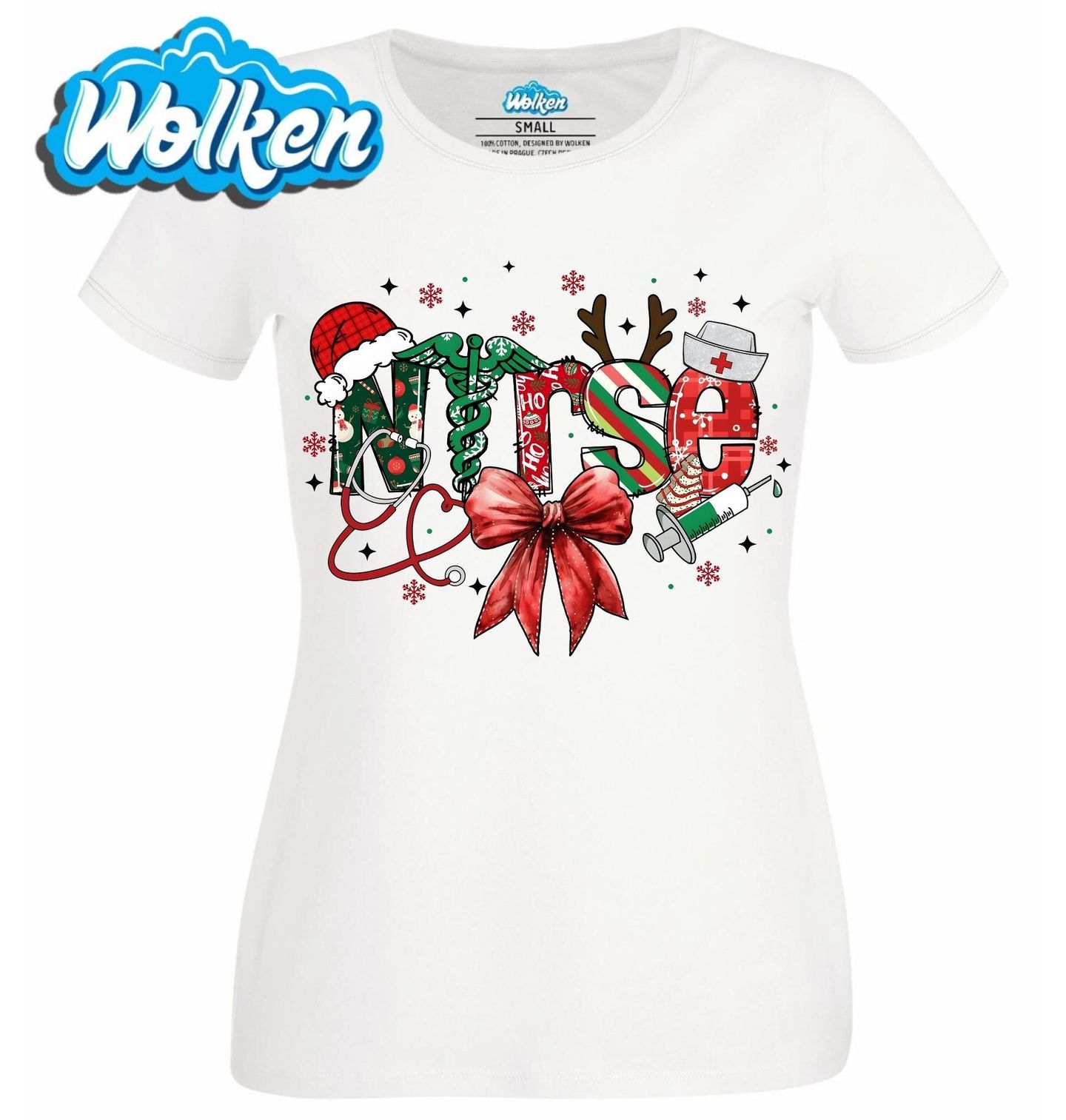 Dámské tričko Vánoční Sestřička Nurse. Originální motiv ideální pro všechny zdravotní sestřičky a pracovníky ve zdravotnictví, kteří milují Vánoce! Tento motiv s nápisem „NURSE“ (sestřička) kombinuje klasické vánoční prvky jako Santa čepice, stužka, sobí parohy, cukroví a vločky se symboly zdravotnictví – stetoskop, injekce, sesterská čepice a znak lékařství.