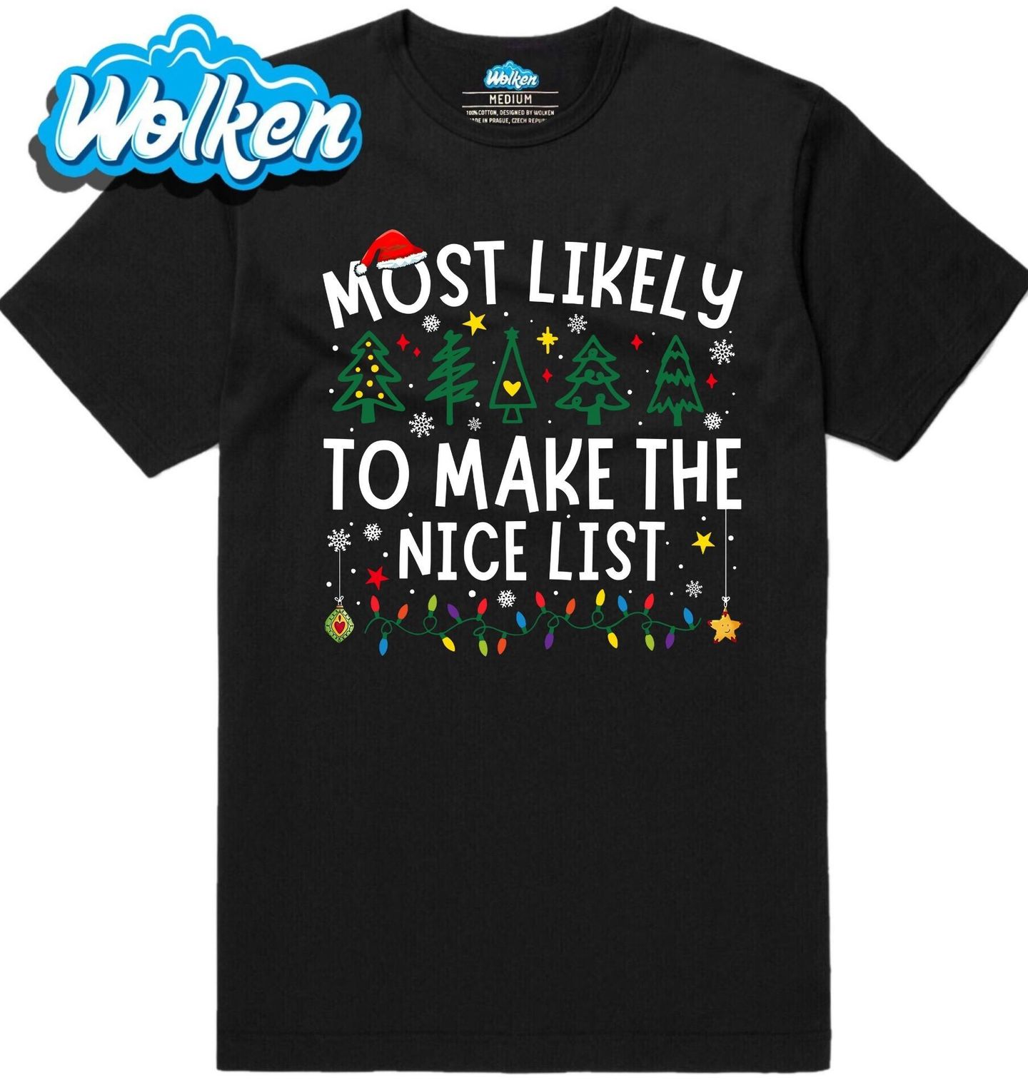 Pánské tričko Vánoční Seznam Hodných. Roztomilý vánoční motiv s anglickým nápisem „Most Likely To Make The Nice List“ (v překladu: „Pravděpodobně se dostanu na seznam hodných“) je ideální pro všechny, kdo si letos (možná) zaslouží pochvalu od Ježíška nebo Santa Clause.
