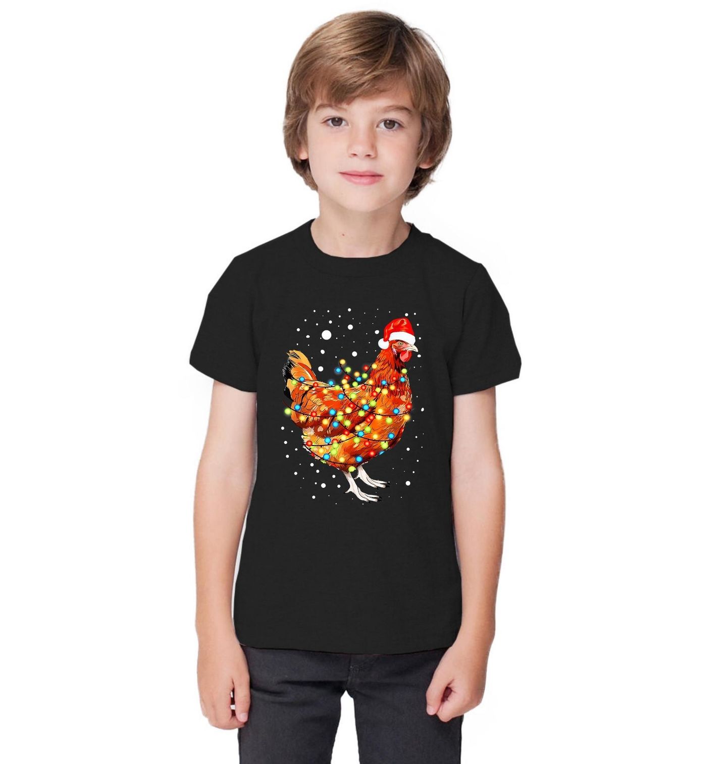 Dětské tričko Vánoční Slepice plná Světel. Vneste do svátků pořádnou dávku humoru a originality s tímto veselým motivem, kde hlavní roli hraje slepice ozdobená vánočními světýlky a čepicí. Ideální volba pro všechny, kdo milují zvířata, originální módu a chtějí si užít Vánoce s nadhledem.