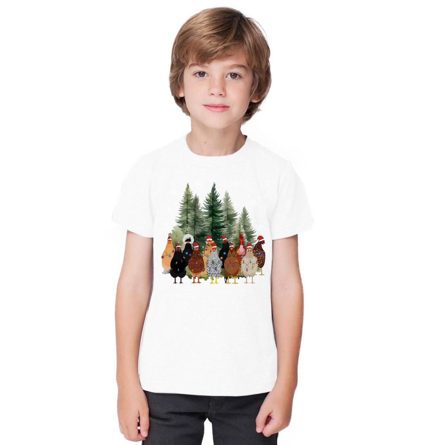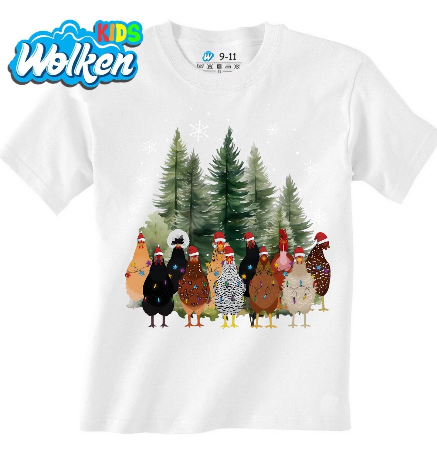 Dětské tričko Vánoční Slepice v Lese. Přeneste se do kouzelného lesa, kde slaví Vánoce i ty nejstylovější slepice! Tento originální motiv plný veselých slepiček v čepičkách, obmotaných světýlky, zasazených do zimního lesa, je ideální pro každého milovníka drůbeže a přírody.